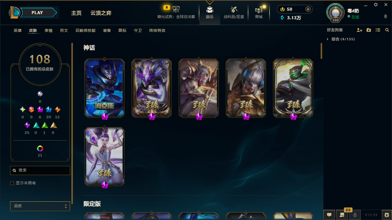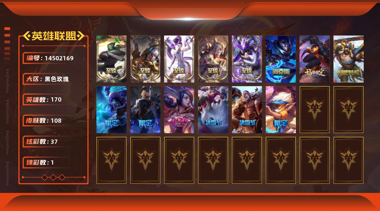 【158373】[14502169]t32169【黑色玫瑰】108皮肤 37炫彩 1臻彩 6神话/20限定/12传说/170英雄 账号等级:398段位黄金【重要皮肤】斗魂觉醒萨科至臻 女帝黛安娜至臻 神龙尊者炎龙瑟提至臻 征服者贾克斯至臻 KDA二代卡莎至臻 海克斯科技嘉文四世 胜利之王泰达米尔 玉剑传说神机花火 玉剑传说翼剑仙 福牛守护者德莱厄斯 甜心之羽霞 圣诞老人布隆