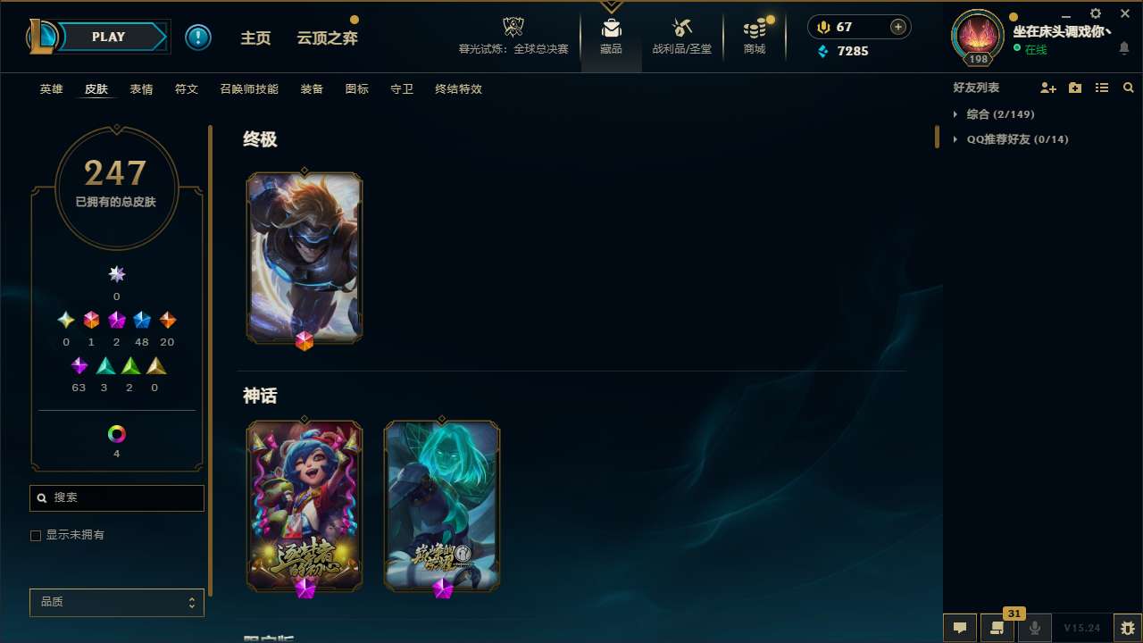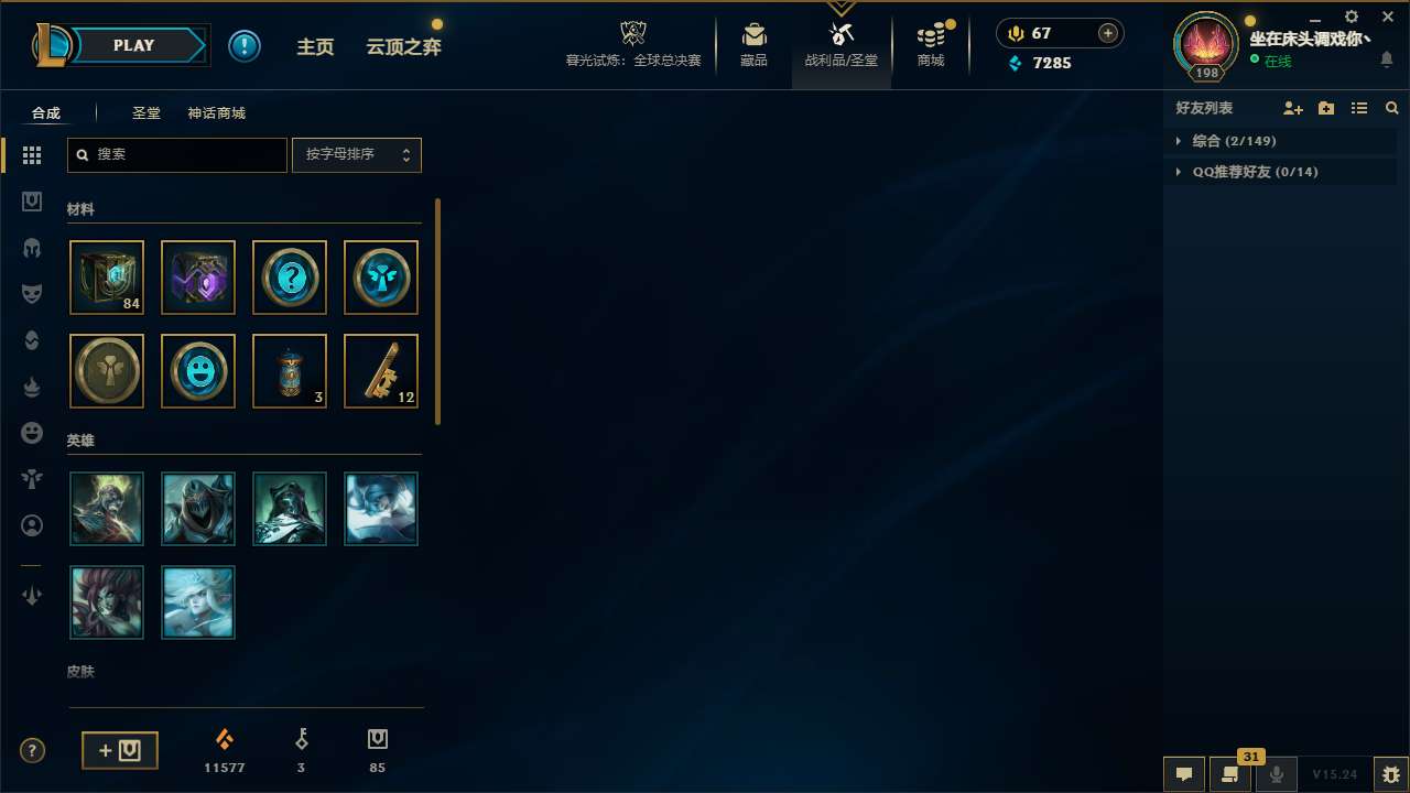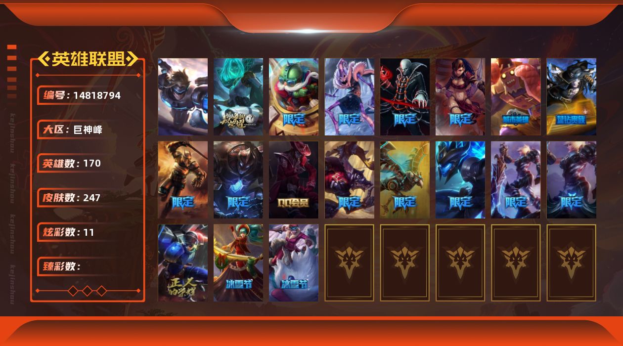 【171787】[14818794]t32753【巨神峰】247皮肤 11炫彩 2神话/48限定/20传说/170英雄 账号等级:198【重要头像】爱情之歌 卡特琳娜的匕首 糖果大战伊芙琳炫彩 【重要皮肤】胜利女神希维尔 钢铁军团拉克丝 电玩女神厄运小姐 胜利之树茂凯 胜利枪神格雷福斯 胜利女神莫甘娜 魄罗骑士瑟庄妮 平安夜女神娑娜 圣诞糖果棒厄运小姐 SSW锤石 SS