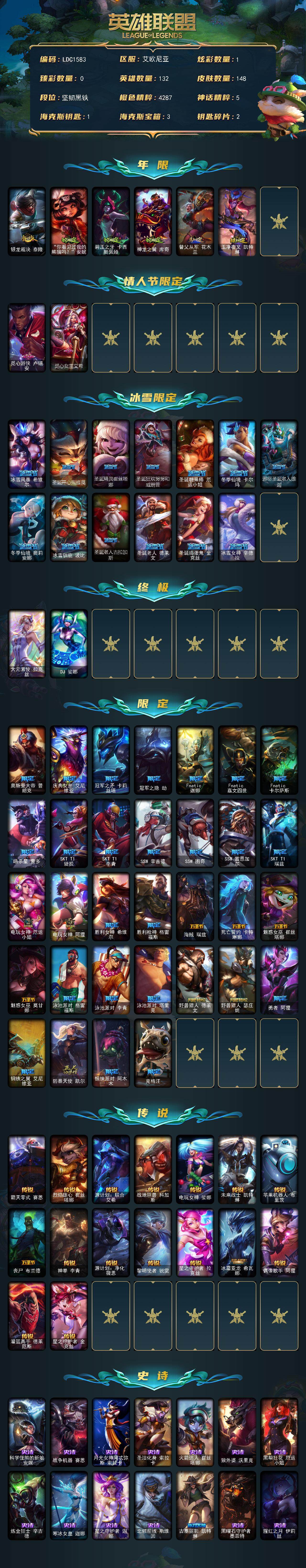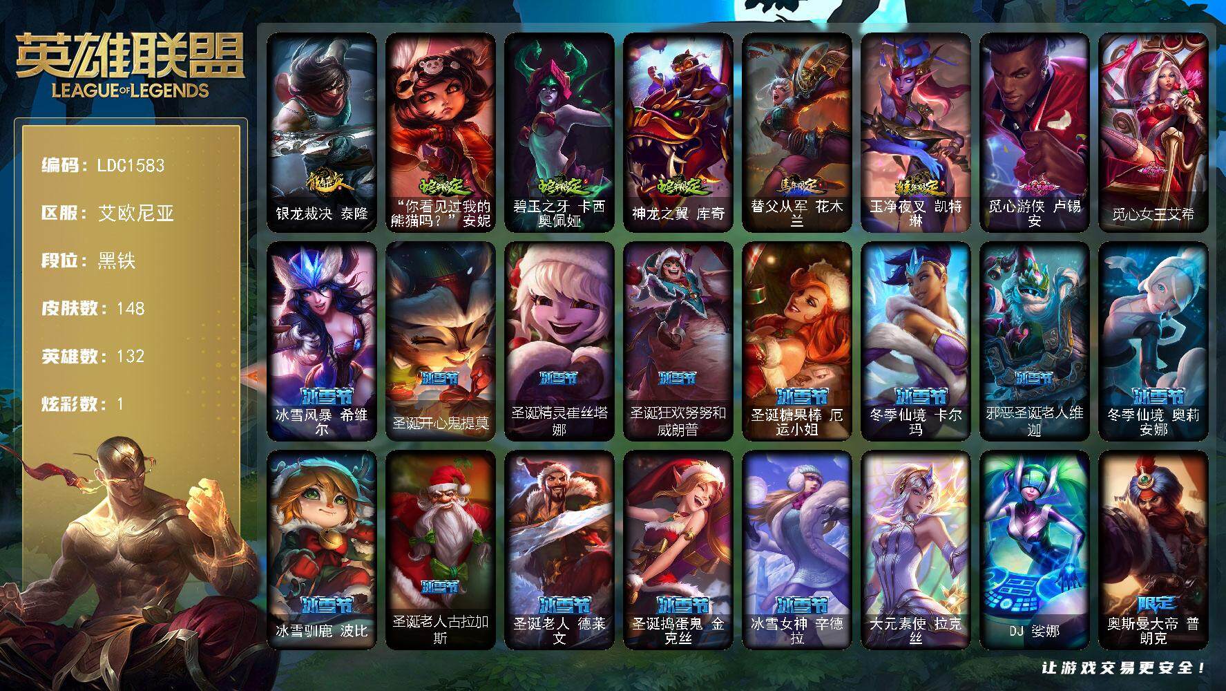 【171875】【LDC1583】132英雄/148皮肤/2终极/53限定/1炫彩/16传说/35史诗/黑铁账号等级:97/银龙裁决泰隆/“你看见过我的熊猫吗?”安妮/碧玉之牙卡西奥佩娅/神龙之翼库奇/替父从军花木兰/玉净夜叉凯特琳/觅心游侠卢锡安/觅心女皇艾希/冰雪风暴希维尔/圣诞开心鬼提莫/圣诞精灵崔丝塔娜/圣诞狂欢努努和威朗普/圣诞糖果棒厄运小姐/冬季仙境卡尔玛/邪恶圣诞老人维迦/冬季仙境