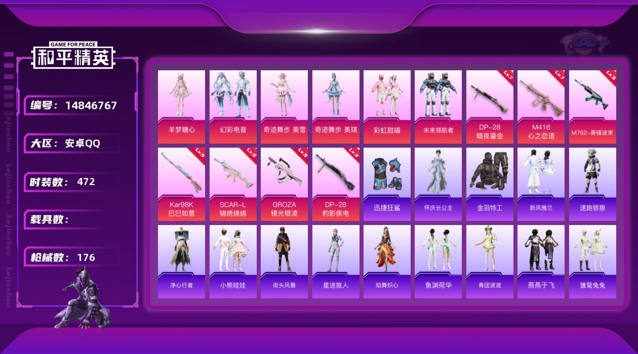 【174912】【不可二次】【安卓QQ】SCAR-L-锦绣绵绵 龟仙人 DP-28-暗夜鎏金 M762-青锋波束 M416-心之恋语 迅捷狂鲨 AKM-缤纷海域 M24-奇异狩猎者 粉红小猪 极速红龙 金羽特工