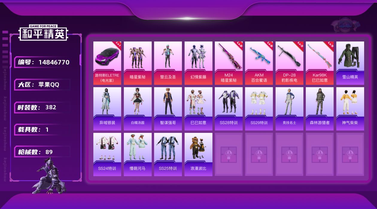 【174914】【可二次】【苹果QQ】龟仙人 暗星紫秘 M762-瑞龙福将 M24-暗星紫秘 极速红龙 豚鼠丹丹 AKM-百合蜜语 幻情紫藤 路特斯EL紫色 浪漫波比 瑞龙福将 慧云及圣 彗云及圣 雪山精英 团圆交子