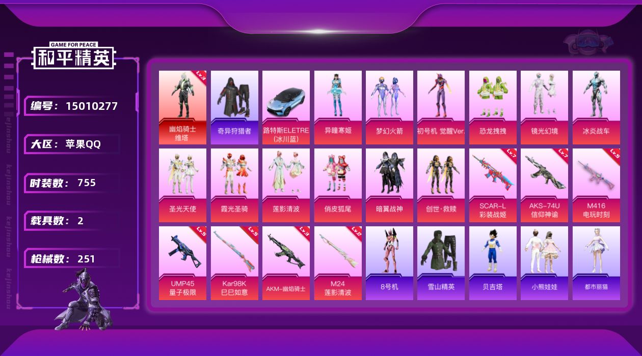 【201899】【不可二次】【苹果QQ】龟仙人 恐龙拽拽 M24-莲影清波 暗翼战神 全功率超战飞行器 极速红龙 豚鼠丹丹 M416-电玩时刻 赛博空间 SCAR-L-彩装战姬 UMP45-量子极限 浪漫波比 M24-香水柠檬 瑞龙福将 镜光幻境飞行翼 团圆交子 奇异狩猎者 M762-瑞龙福将 海洋之心 幽焰骑士-维塔 梦幻火箭 AKM-缤纷海域 俏皮狐尾 雪山精英 路特斯EL蓝色