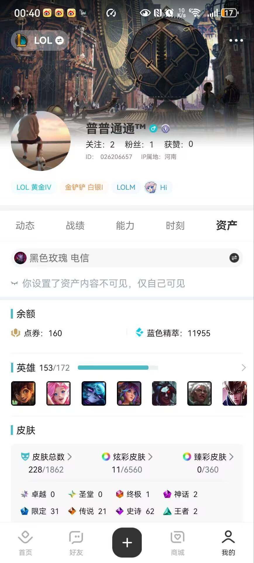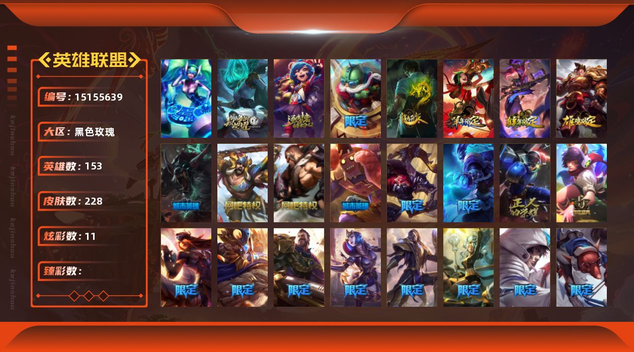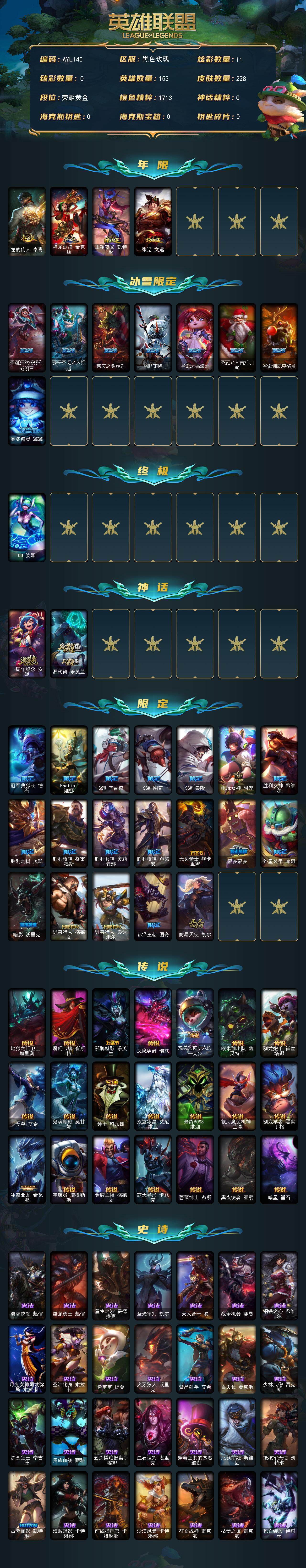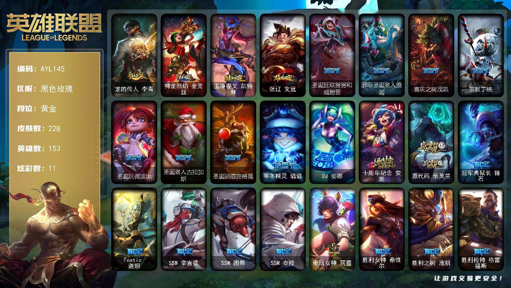 【227997】[15155639]黄金段位-153英雄-228皮肤-11炫彩-1终极-2神话-31限定-21传说-62史诗【年限皮肤】:龙的传人李青,神龙烈焰金克丝,玉净夜叉凯特琳,张辽文远【冰雪限定】:圣诞狂欢努努和威朗普,邪恶圣诞老人维迦,喜庆之树茂凯,雪默丁格,圣诞玩偶波比,圣诞老人古拉加斯,圣诞驯鹿克格莫,寒冬精灵璐璐【终极皮肤】:DJ娑娜【神话皮肤】:十周年纪念安妮,源代码乐芙兰【限