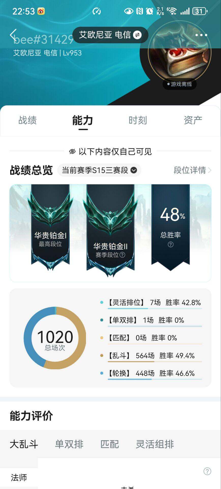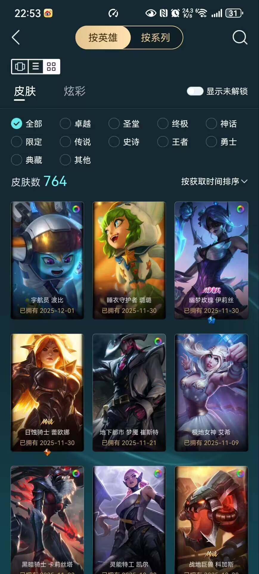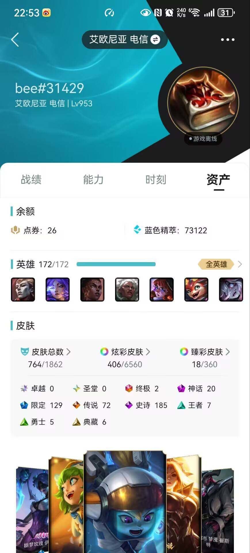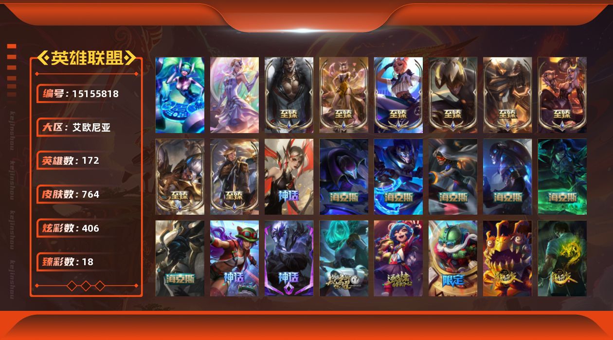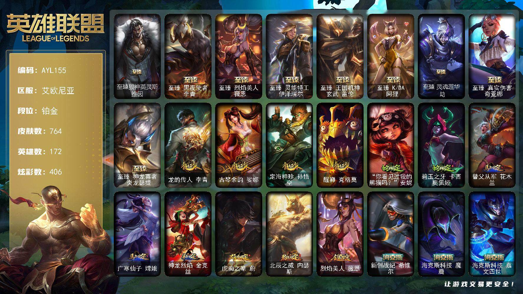 【228025】[15155818]【店主推荐捡漏号!可直接换绑】铂金段位-172英雄-764皮肤-406炫彩-2终极-20神话-129限定-72传说-185史诗【珍稀头像】:女巫头头像【热门头像】:卡特琳娜的匕首头像【至臻皮肤】:至臻狼神英灵斯维因,至臻黑夜使者李青,至臻烈焰美人薇恩,至臻灵能特工伊泽瑞尔,至臻王国机神玄武盖伦,至臻KDA阿狸,至臻灵魂莲华劫,至臻真实伤害奇亚娜,至臻神龙尊者炎