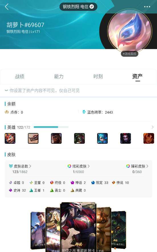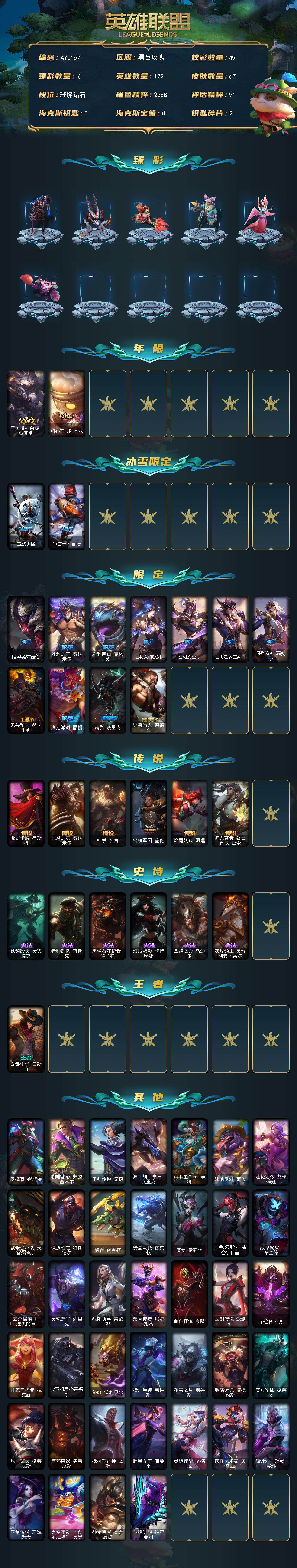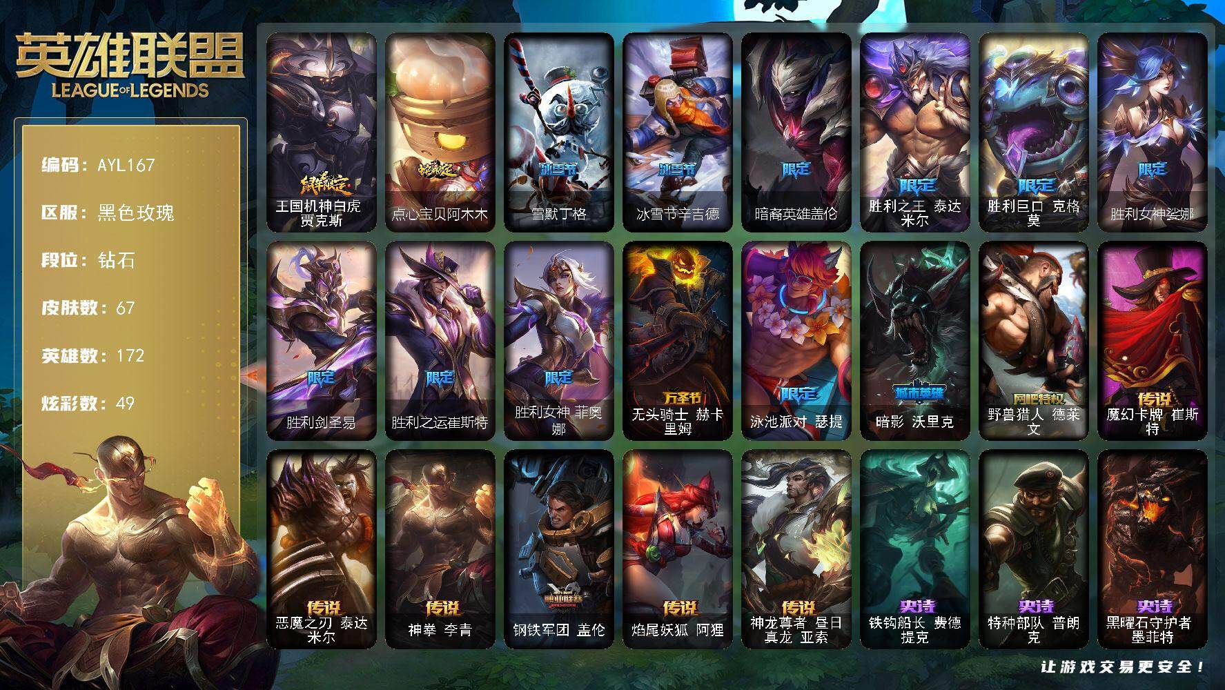 【228083】[15156138]钻石段位-172英雄-67皮肤-49炫彩-0终极-0神话-15限定-6传说-6史诗【臻彩皮肤】:玉剑传说无劫胭脂,霸天异形卡兹克刹那银光,玉剑传说寒潭夭夭胭脂,玉剑传说神机花火青竹,玉剑传说苍鸾丁香,可爱可爱粉红红布里茨【年限皮肤】:王国机神白虎贾克斯,点心宝贝阿木木【冰雪限定】:雪默丁格,冰雪节辛吉德【限定皮肤】:暗裔英雄盖伦,胜利之王泰达米尔,胜利巨口克格