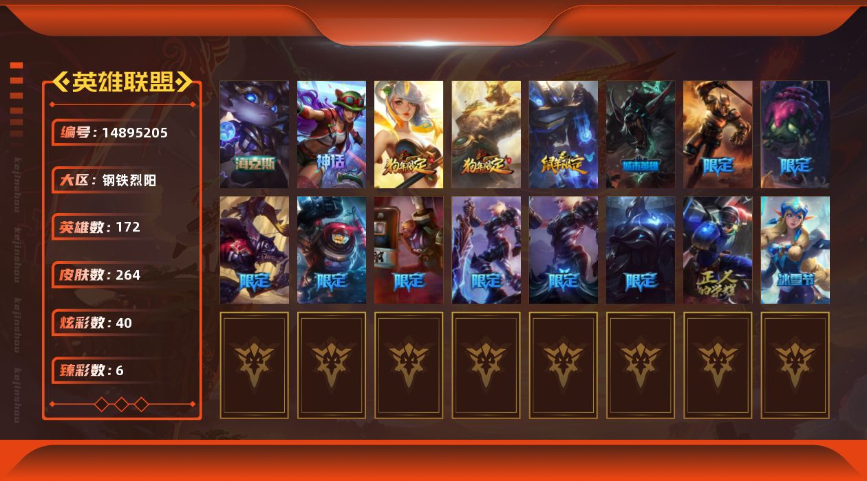 【238020】[14895205]t32911 皇冠账号【钢铁烈阳】 264皮肤 40炫彩 6臻彩 3神话/36限定/23传说/172英雄 账号等级:910 单双排段位:黄金【重要头像】爱意绵绵 幻灵战斗猫金克丝炫彩 【重要皮肤】海克斯科技波比 胜利剑圣易 胜利女神娑娜 胜利之王泰达米尔 胜利巨口克格莫 荣誉使者玛尔扎哈 电玩勇者锐雯 电玩女神阿狸 点心宝贝阿木木 春晖神
