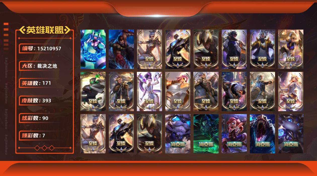 【238041】[15210957]裁决之地 黄金段位-171英雄-393皮肤-90炫彩-2终极-25神话-50限定-44传说-96史诗【热门头像】:爱情之歌头像,觅心之翼奎因头像,星守索拉卡头像【至臻皮肤】:至臻星之守护者索拉卡,至臻征服者贾克斯,至臻黑夜使者李青,至臻黑夜使者李青(2022),至臻灵能特工伊泽瑞尔,至臻战斗学院蕾欧娜,至臻玉剑传说武剑仙锐雯,至臻玉剑传说武剑仙(2022),至