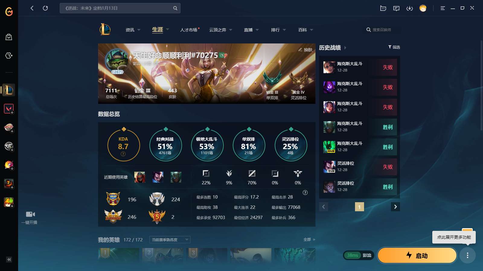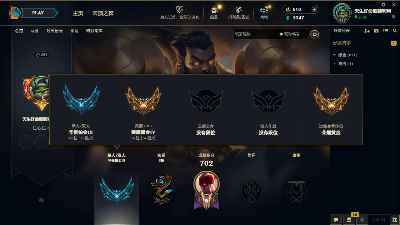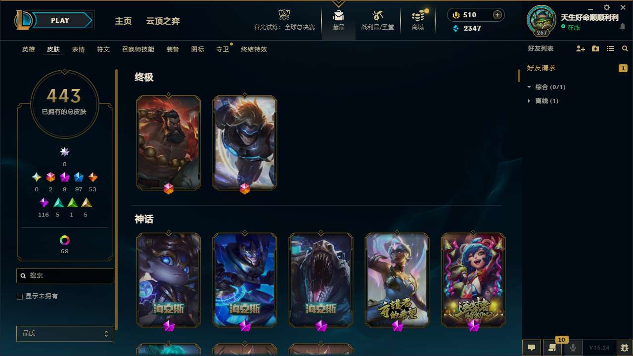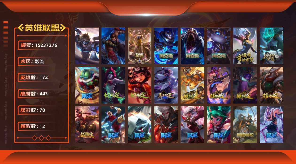 【242450】[15237276]t33531【影流】原皮龙瞎 443皮肤 78炫彩 12臻彩 8神话/97限定/53传说/172英雄 账号等级:267 单双排段位:铂金【重要头像】爱情之歌 觅心游侠卢锡安 战斗学院拉克丝 救生圈 KDA萨勒芬妮 美猴王孙悟空 征服者韦鲁斯炫金 【重要皮肤】KDA阿狸至臻 KDA阿狸2022至臻 海克斯科技雷克顿 海克斯科技波比 海克斯科