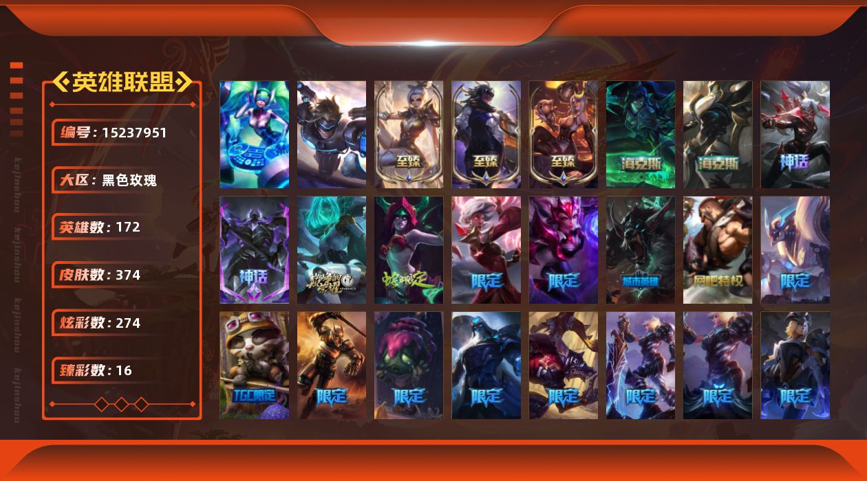【242575】[15237951]t33503 皇冠账号【黑色玫瑰】原皮龙瞎 374皮肤 274炫彩 16臻彩 12神话/57限定/41传说/172英雄 账号等级:1073【重要头像】爱意绵绵 爱情之歌 觅心之翼奎因 我麦是开的么 KDA萨勒芬妮 青花瓷伊泽瑞尔炫彩 剪纸仙灵艾瑞莉娅炫彩 烈焰美人薇恩 【重要皮肤】真实伤害赛娜至臻 烈焰美人薇恩至臻 烈焰美人薇恩2022至臻