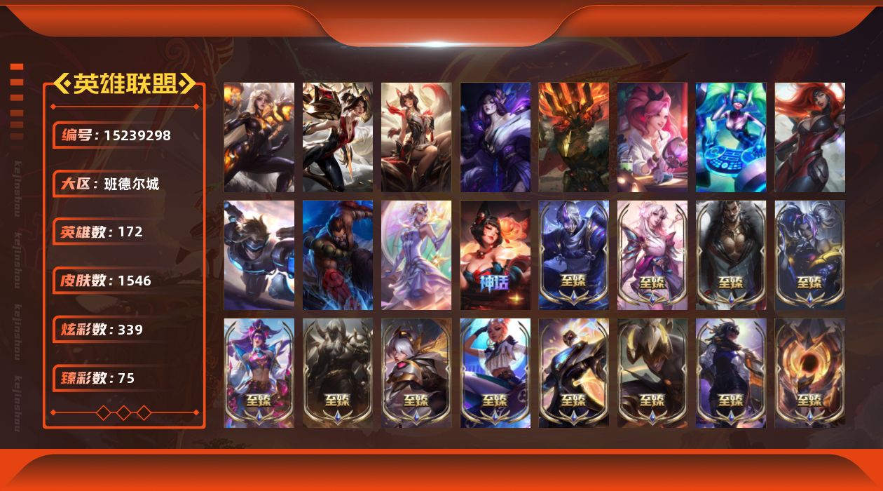 【242828】[15239298]t32413 皇冠账号【班德尔城】签名版联盟不朽卡莎 殿堂传奇卡莎 殿堂传奇阿狸 灵魂莲华莫甘娜 萨恩乌祖尔莫德凯撒 1546皮肤 339炫彩 75臻彩 47神话/299限定/129传说/172英雄 账号等级:402 云顶神话:7 【重要头像】星守阿狸 银河魔装机神安妮 大家伙 萨勒芬妮超级巨星 萨勒芬妮独立音乐人 我麦是开的么 万圣节卡特琳娜 救生圈 EDG