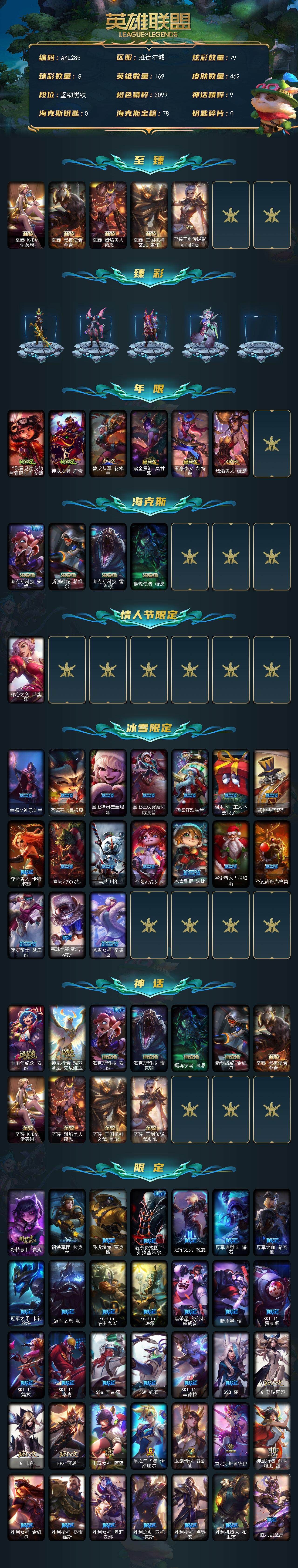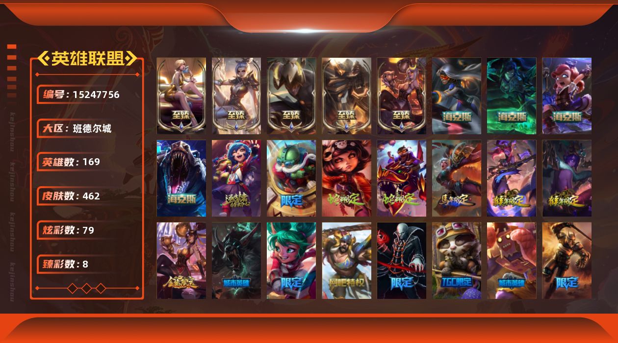 【244453】[15247756]【店主推荐捡漏号!可直接换绑】未定级段位-169英雄-462皮肤-79炫彩-0终极-11神话-82限定-36传说-118史诗【至臻皮肤】:至臻KDA伊芙琳,至臻黑夜使者李青,至臻烈焰美人薇恩,至臻王国机神玄武盖伦,至臻玉剑传说武剑仙锐雯【臻彩皮肤】:天龙之子卡莎飞龙乘云,玉净夜叉凯特琳炫金神机,墨之影武者亚索金墨耀影,弹幕天使卡莎炽天使勇敢,星之守护者霞烈羽,