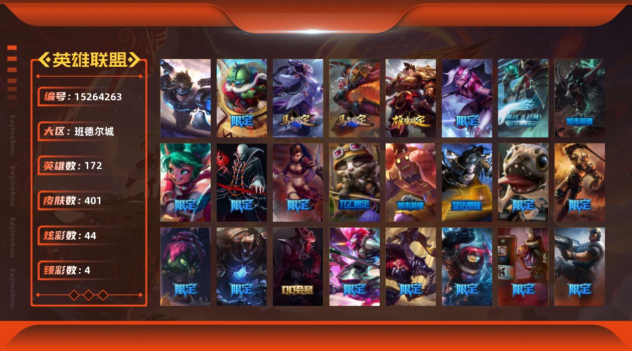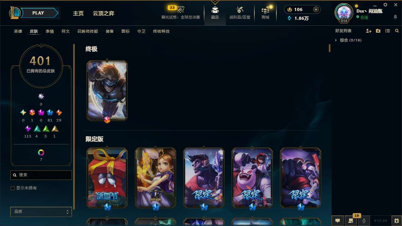 【247894】[15264263]t32425 皇冠账号【班德尔城】401皮肤 11炫彩 1臻彩 0神话/81限定/29传说/172英雄 账号等级:216 单双排段位:黄金 【重要皮肤】胜利剑圣易 安妮梦游仙境 勇敢的心德莱厄斯 替父从军花木兰 古琴余韵娑娜 广寒仙子嫦娥 张辽文远 醒狮克格莫 胜利枪神格雷福斯 甜心宝贝安妮 觅心猎手薇恩 冰雪风暴希维尔 魄罗骑士瑟庄妮 平安夜女神娑娜 圣诞糖