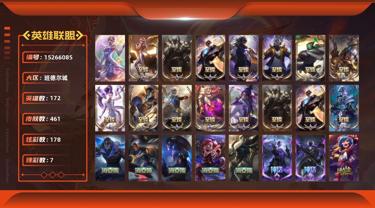 【248120】[15266085]【特价出售/店主推荐】未定级段位-172英雄-461皮肤-178炫彩-1终极-24神话-60限定-52传说-88史诗【至臻皮肤】:至臻灵魂莲华易,至臻征服者贾克斯,至臻飞升战神潘森,至臻神龙尊者均衡之龙沃利贝尔,至臻黑夜使者凯隐,至臻KDA卡莎,至臻KDAALLOUT卡莎,至臻真实伤害亚索,至臻北极星钢影卡蜜尔,至臻真实伤害赛娜,至臻腥红之月亚托克斯,至臻腥红