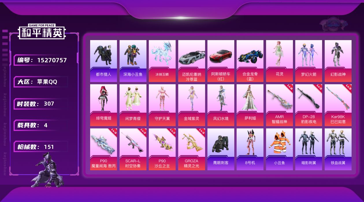 【248922】【不可二次】【苹果QQ】合金龙骨蓝色 SCAR-L-时空协奏 红熊茄茄 漫步者 P90-沙丘之主 都市猎人 龙翔九天飞行器 M762-奇异狩猎者 梦幻火箭 阿斯顿马丁S红色 AKM-缤纷海域 AKM-百万伏特 GROZA-精灵之光 深海小丑鱼 幻影战神