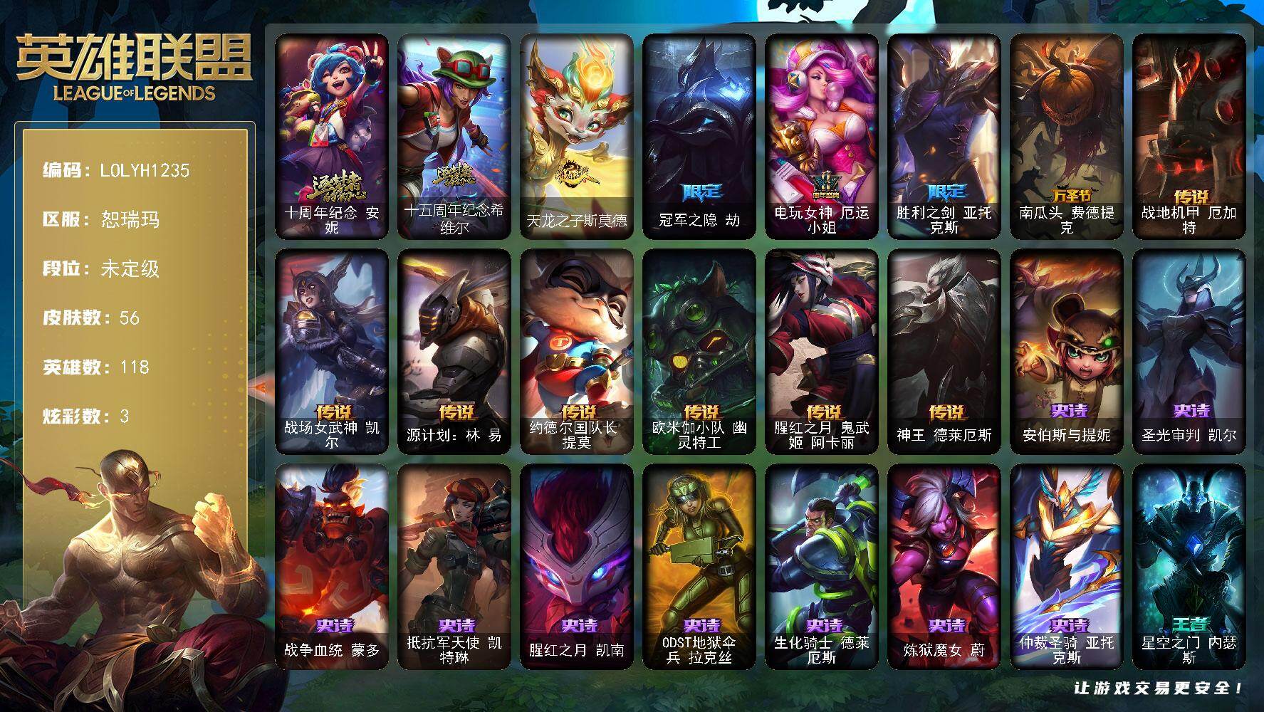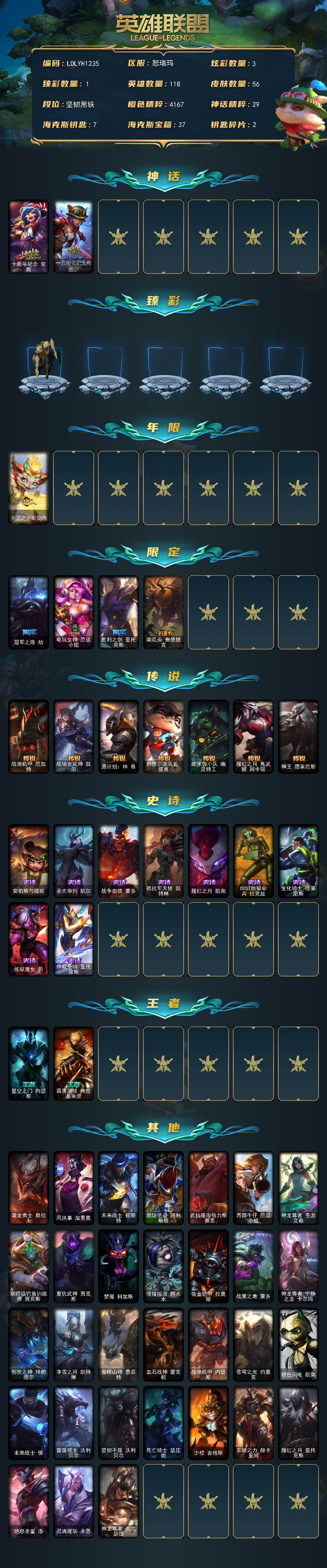 【432089】【LOLYH1235】118英雄/56皮肤/2神话/5限定/1臻彩/3炫彩/7传说/9史诗/未定级/十周年纪念安妮/十五周年纪念希维尔/冠军之隐劫凯旋圣装/天龙之子斯莫德/冠军之隐劫/电玩女神厄运小姐/胜利之剑亚托克斯/南瓜头费德提克/战地机甲厄加特/战场女武神凯尔/源计划:林易/约德尔国队长提莫/欧米伽小队幽灵特工/腥红之月鬼舞姬阿卡丽/神王德莱厄斯/安伯斯与提妮/圣光审判凯尔