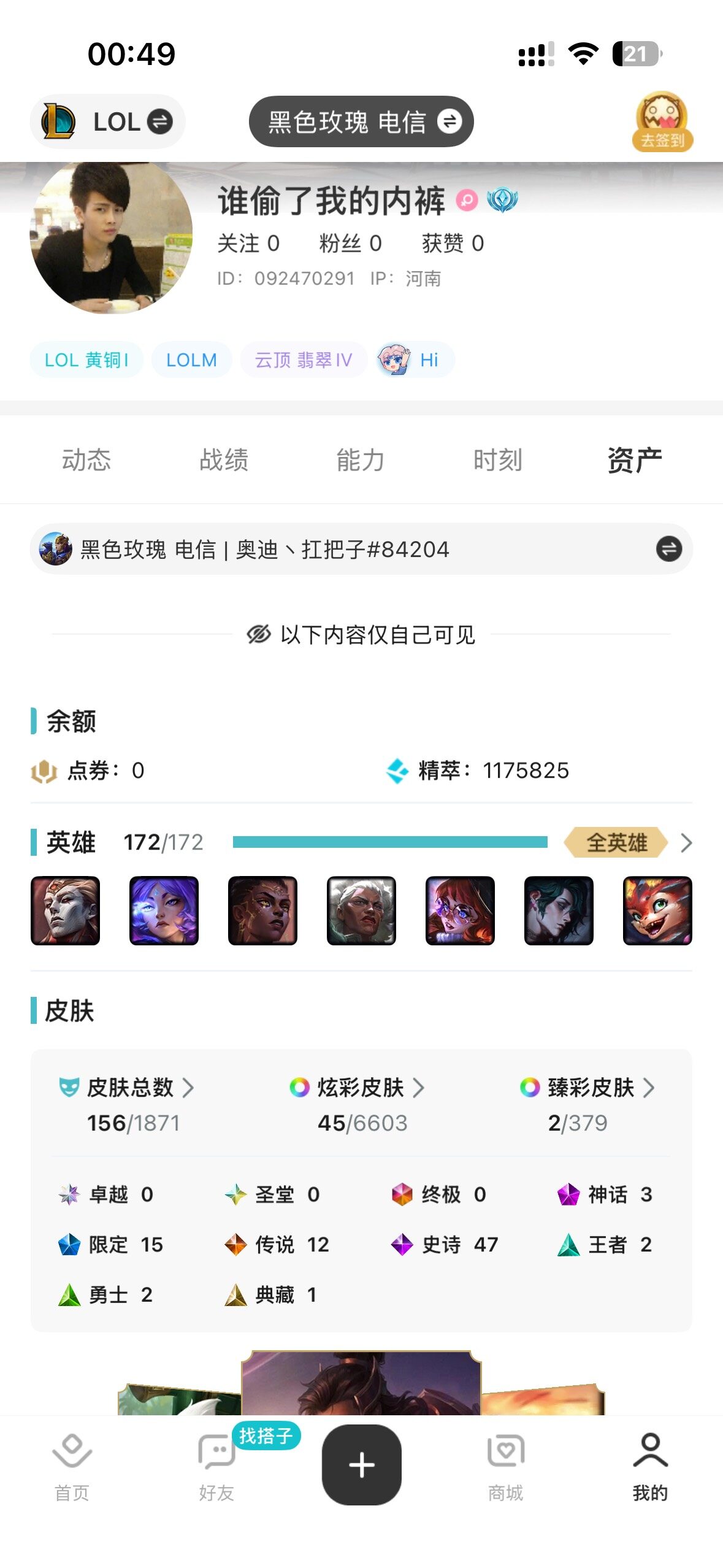 【436640】[16507051]【特价出售/店主推荐】青铜段位-172英雄-156皮肤-45炫彩-0终极-3神话-15限定-12传说-47史诗【热门头像】:觅心之翼奎因头像【臻彩皮肤】:玉剑传说无劫胭脂,魔女阿卡丽虚荣【年限皮肤】:天龙之子斯莫德【冰雪限定】:圣诞开心鬼提莫,圣诞糖果棒厄运小姐,寒冬精灵璐璐【神话皮肤】:十周年纪念安妮,源代码乐芙兰,十五周年纪念希维尔【限定皮肤】:送披萨的小