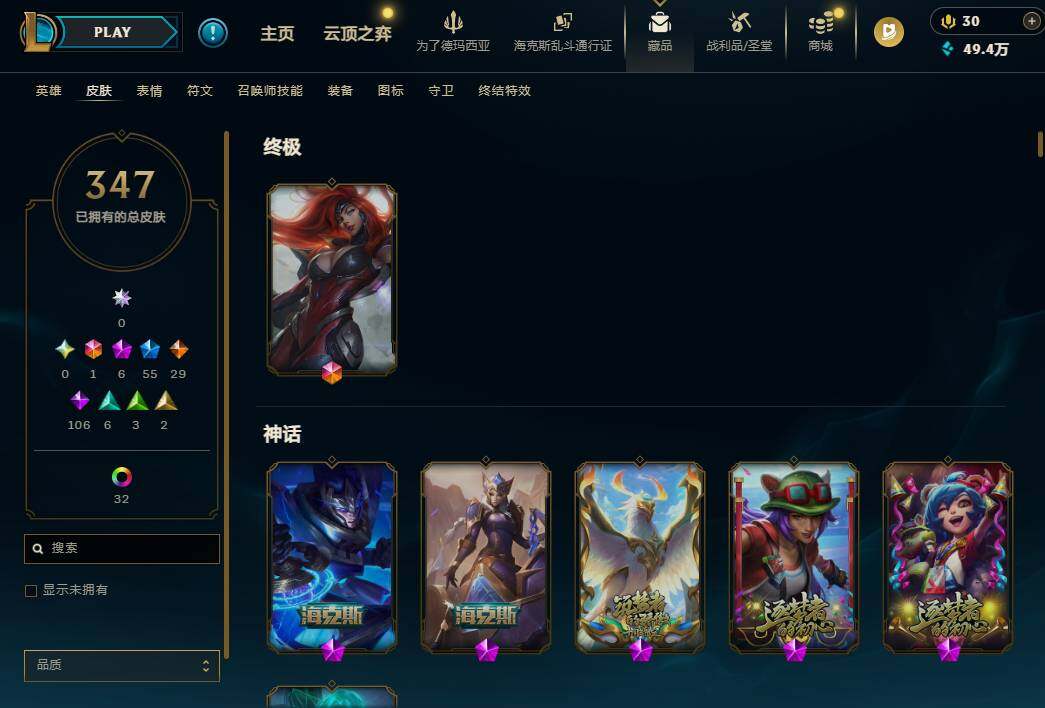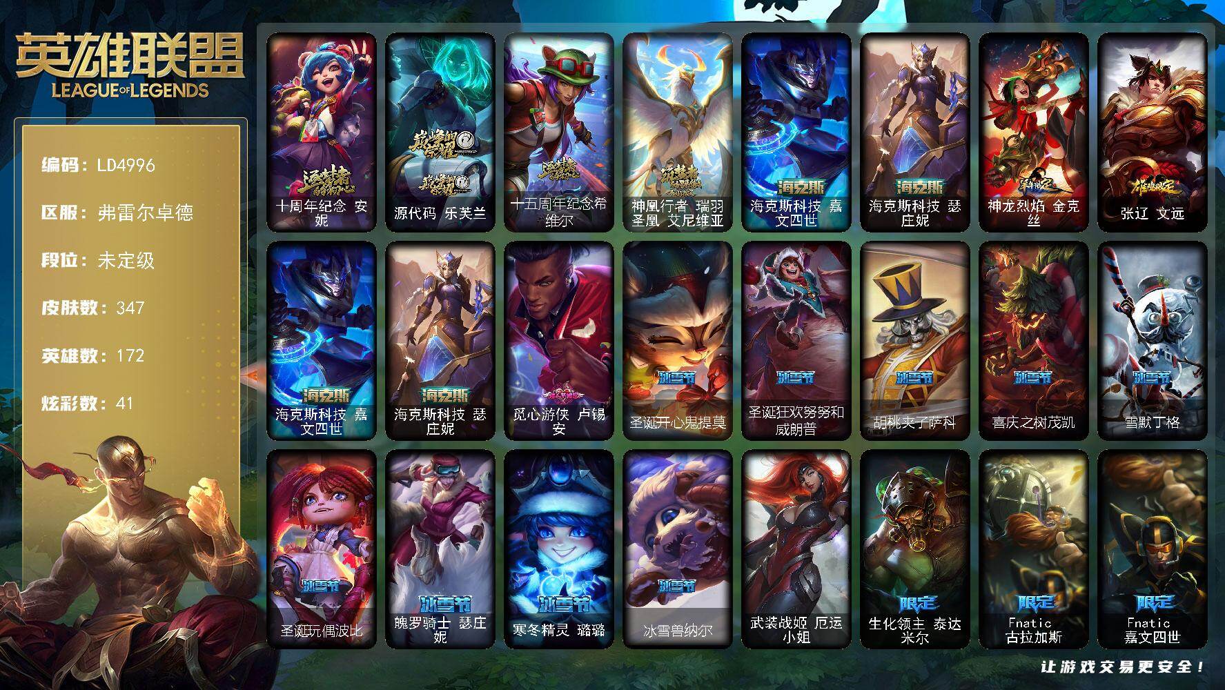 【436955】【LD4996】172英雄/347皮肤/1终极/6神话/55限定/6臻彩/41炫彩/29传说/106史诗/未定级/十周年纪念安妮/源代码乐芙兰/十五周年纪念希维尔/神凰行者瑞羽凤凰艾尼维亚/海克斯科技嘉文四世/海克斯科技瑟庄妮/觅心之翼奎因/天龙之子卡莎飞龙乘云/征服者韦鲁斯炫金/冠军之隐劫凯旋圣装/玉剑传说苍鸾丁香/魔女阿卡丽虚荣/净雪之月莫甘娜冬虹/神龙烈焰金克丝/张辽文远/
