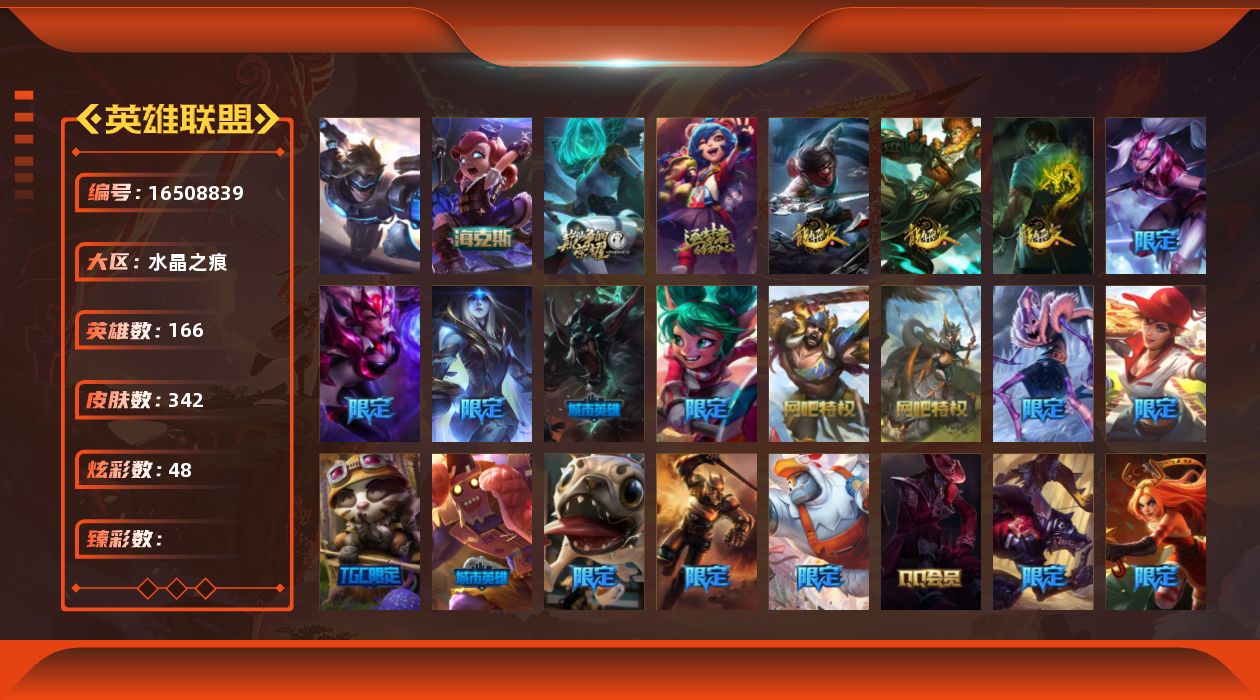 【436970】[16508839]1终极 3神话 60限定 29传说 100史诗 342皮肤 48炫彩 166英雄 可二次 可修改实名 【海克斯】海克斯 安妮【限定】创星之灵 璐璐【情人节限定】觅心女王 艾希【赛季限定皮】胜利女神 奥莉安娜【冠军限定系列】S1FNC 酒桶,S1FNC 迦娜,S2 暗杀星 发条,S2 暗杀星 蒙多,S2 暗杀星 慎,S3 SKT T1 贾克斯,S3 SKT T1