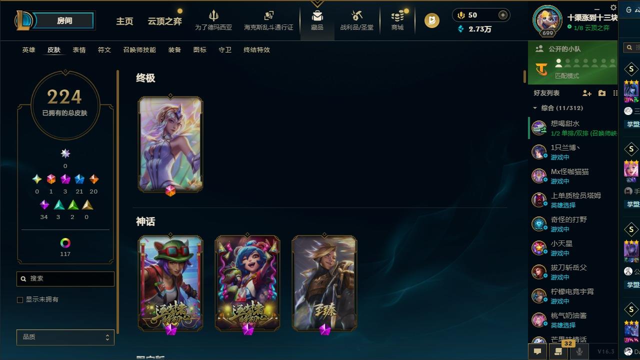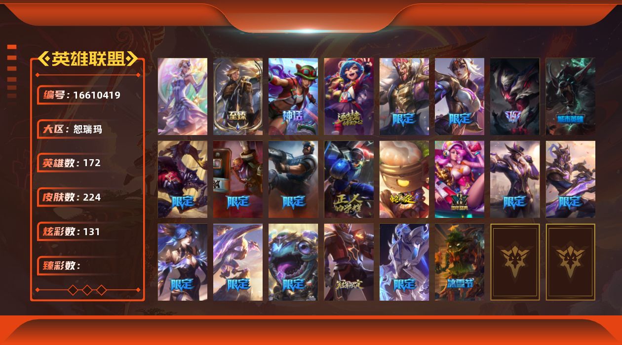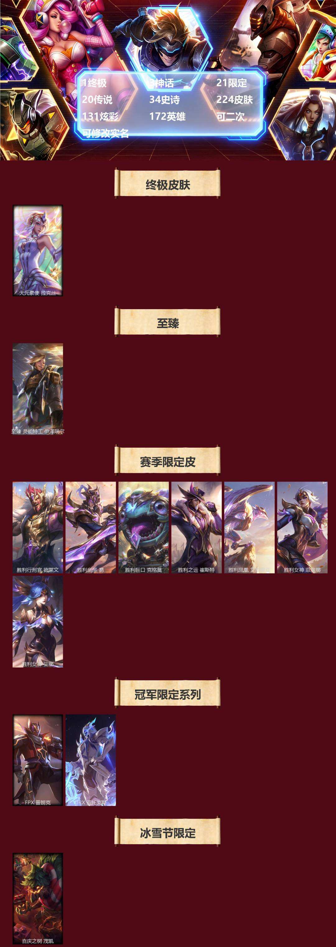 【450912】[16610419]1终极 3神话 21限定 20传说 34史诗 224皮肤 131炫彩 172英雄 可二次 可修改实名 【至臻】至臻 灵能特工 伊泽瑞尔【赛季限定皮】胜利行刑官 德莱文,胜利凤凰 艾尼维亚,胜利女神-菲奥娜,胜利之运 崔斯特,胜利剑圣 易,胜利女神 娑娜,胜利巨口 克格莫【冠军限定系列】S9 FPX 普朗克,S12 DRX 亚托克斯【冰雪节限定】喜庆之树 茂凯【