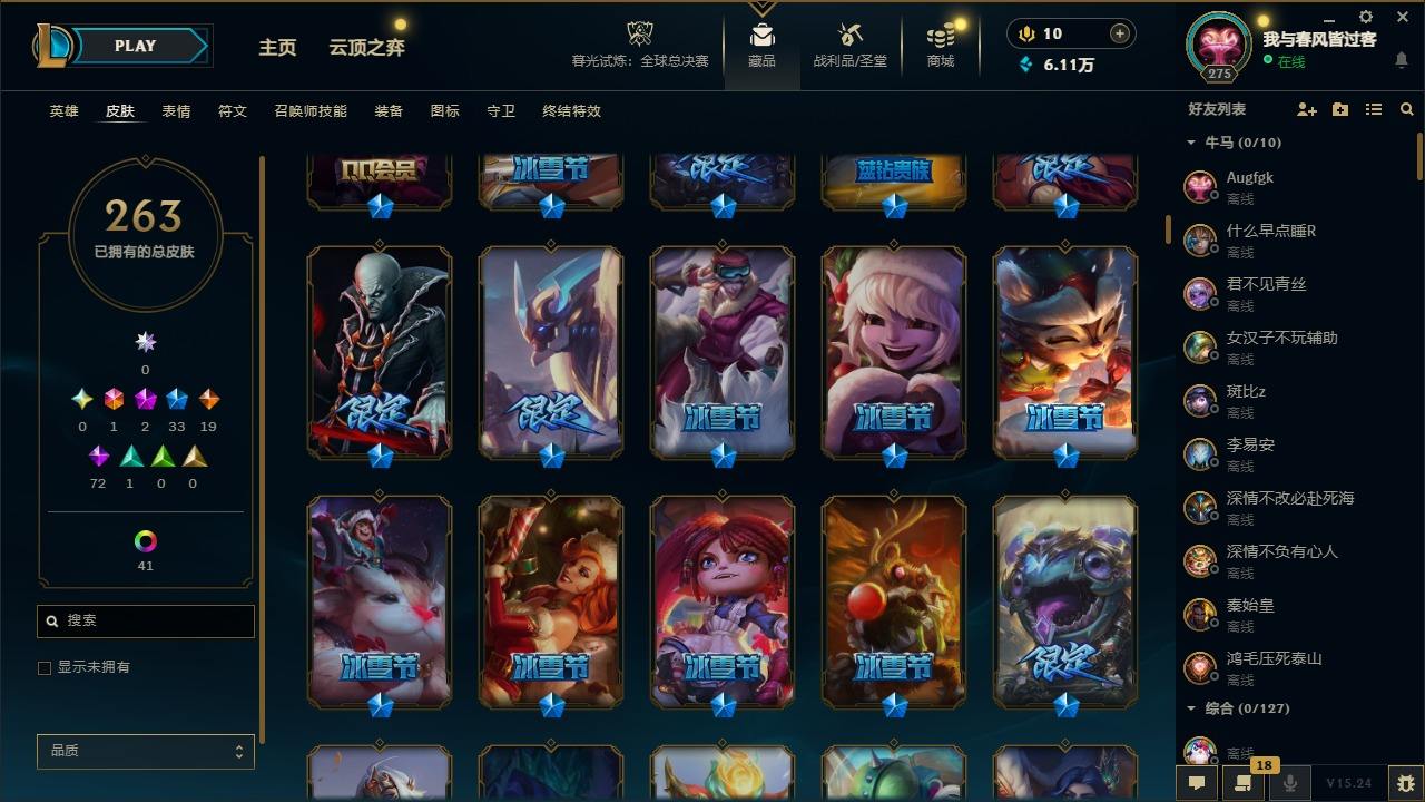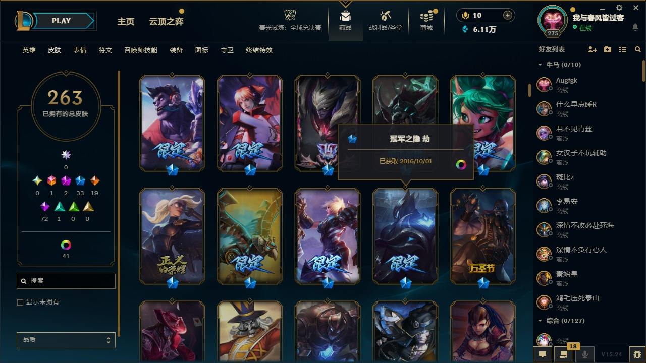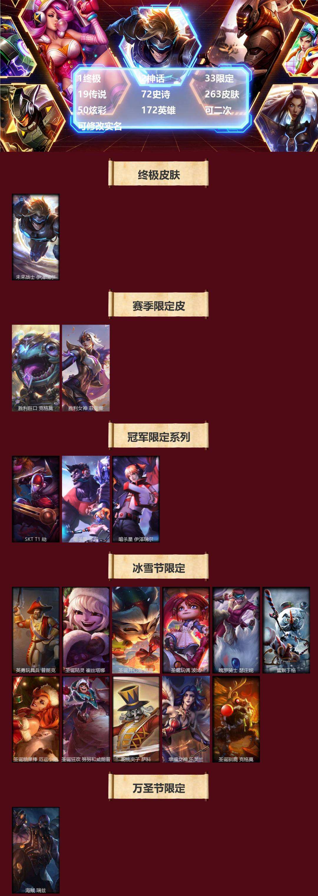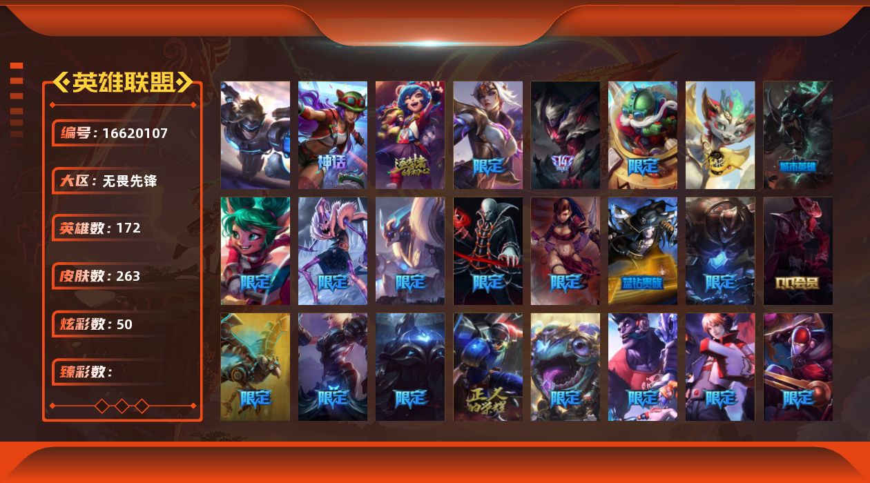 【451765】[16620107]1终极 2神话 33限定 19传说 72史诗 263皮肤 50炫彩 172英雄 可二次 可修改实名 【赛季限定皮】胜利女神-菲奥娜,胜利巨口 克格莫【冠军限定系列】S2 暗杀星 蒙多,S2 暗杀星 伊泽瑞尔,S3 SKT T1 劫【冰雪节限定】胡桃夹子 萨科,魄罗骑士 瑟庄妮,圣诞开心鬼 提莫,圣诞精灵 崔丝塔娜,圣诞狂欢 努努和威朗普,圣诞糖果棒 厄运小姐,