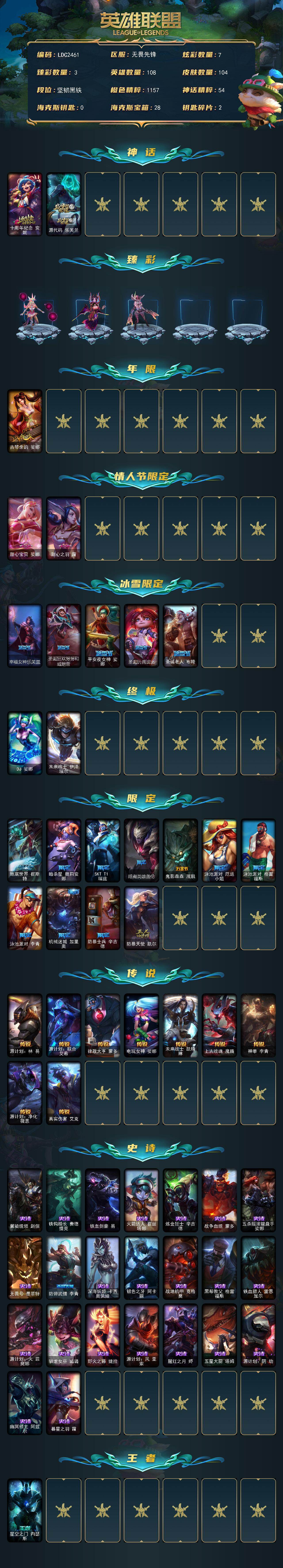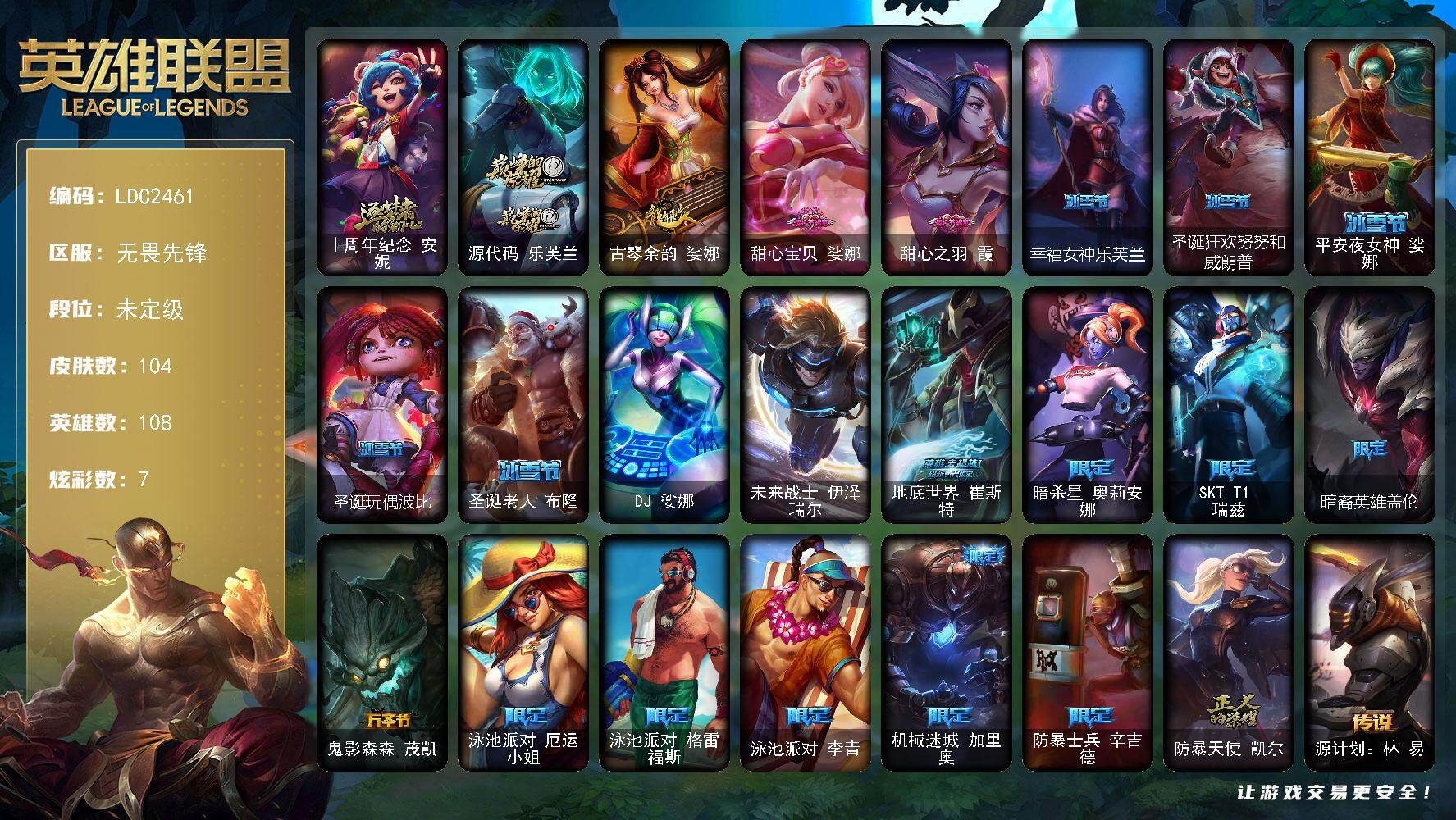 【452021】【LDC2461】108英雄/104皮肤/2终极/2神话/20限定/3臻彩/7炫彩/9传说/23史诗/未定级/十周年纪念安妮/源代码乐芙兰/星之守护者辛德拉未来之光/星之吞噬者莫甘娜热情之末/破败军团厄运小姐灵岛征伐使/古琴余韵娑娜/甜心宝贝娑娜/甜心之羽霞/幸福女神乐芙兰/圣诞狂欢努努和威朗普/平安夜女神娑娜/圣诞玩偶波比/圣诞老人布隆/DJ娑娜/未来战士伊泽瑞尔/地底世界崔斯