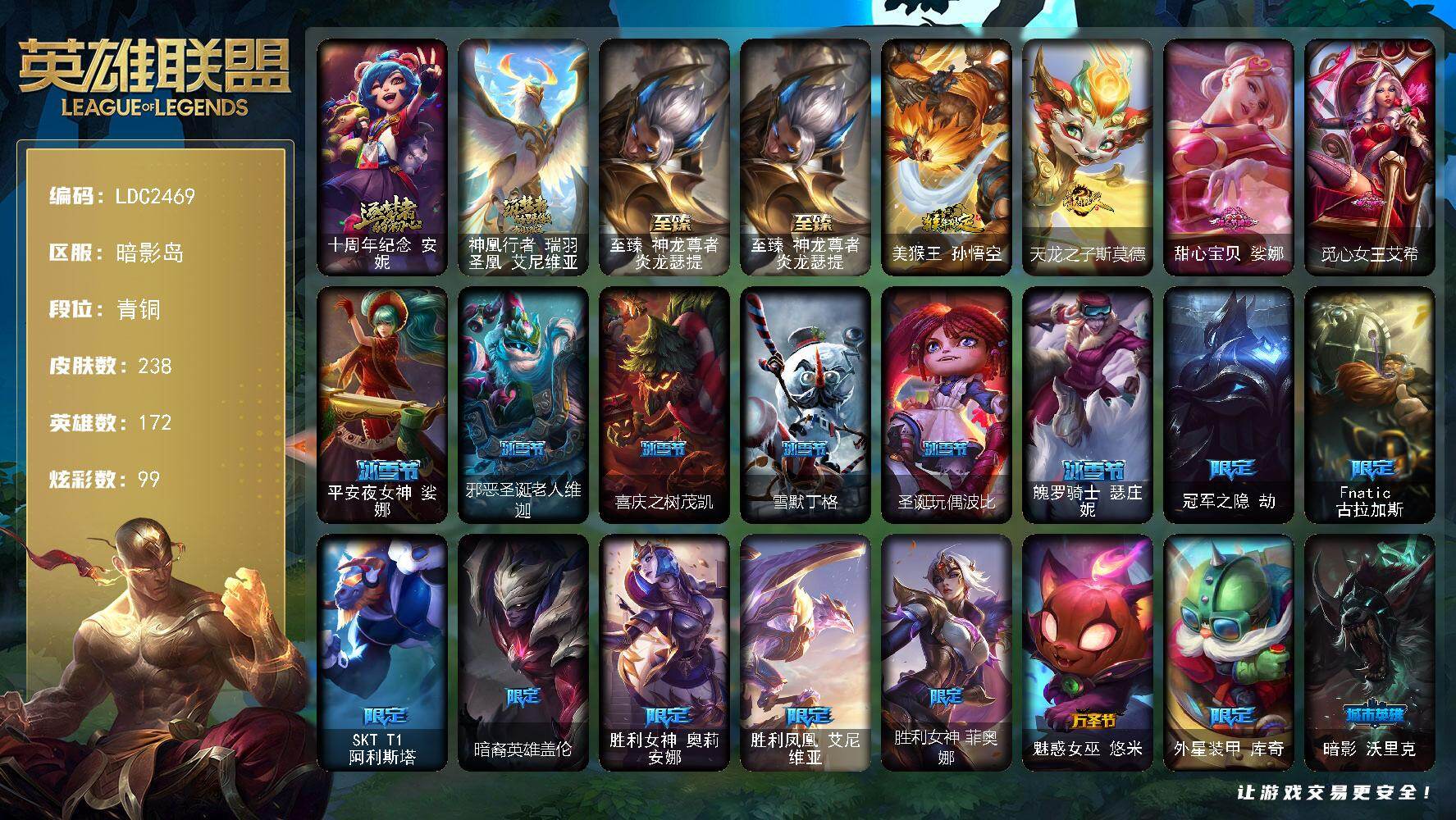 【455143】【LDC2469】172英雄/238皮肤/3神话/25限定/6臻彩/99炫彩/24传说/74史诗/青铜/十周年纪念安妮/神凰行者瑞羽凤凰艾尼维亚/至臻神龙尊者炎龙瑟提/无畏骑士瑟庄妮赤子初心/星之守护者辛德拉未来之光/源计划火菲奥娜惩戒/春晖神女艾希玉露金风/魔女阿卡丽虚荣/净雪之月莫甘娜冬虹/美猴王孙悟空/天龙之子斯莫德/甜心宝贝娑娜/觅心女皇艾希/平安夜女神娑娜/邪恶圣诞老人