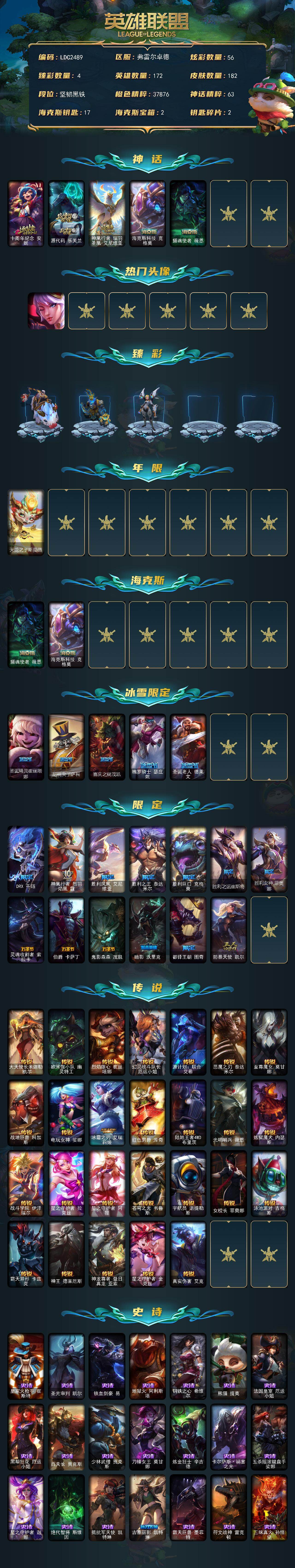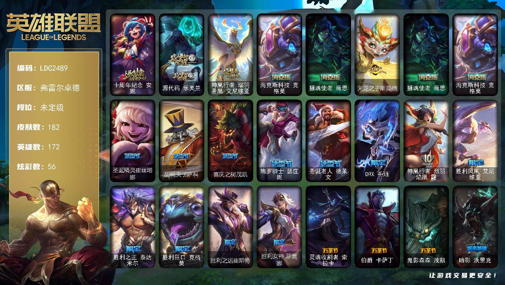 【464375】【LDC2489】172英雄/182皮肤/5神话/20限定/4臻彩/56炫彩/26传说/42史诗/未定级/十周年纪念安妮/源代码乐芙兰/神凰行者瑞羽凤凰艾尼维亚/海克斯科技克格莫/摄魂使者薇恩/觅心之翼奎因/无畏骑士瑟庄妮赤子初心/冠军典狱长锤石凯旋圣装/弹幕天使卡莎炽天使公正/魔女阿卡丽虚荣/天龙之子斯莫德/圣诞精灵崔丝塔娜/胡桃夹子萨科/喜庆之树茂凯/魄罗骑士瑟庄妮/圣诞老人