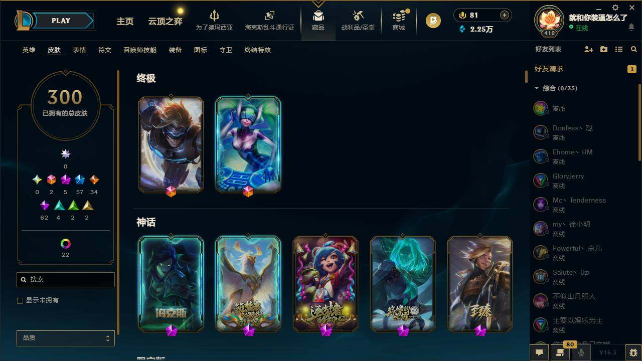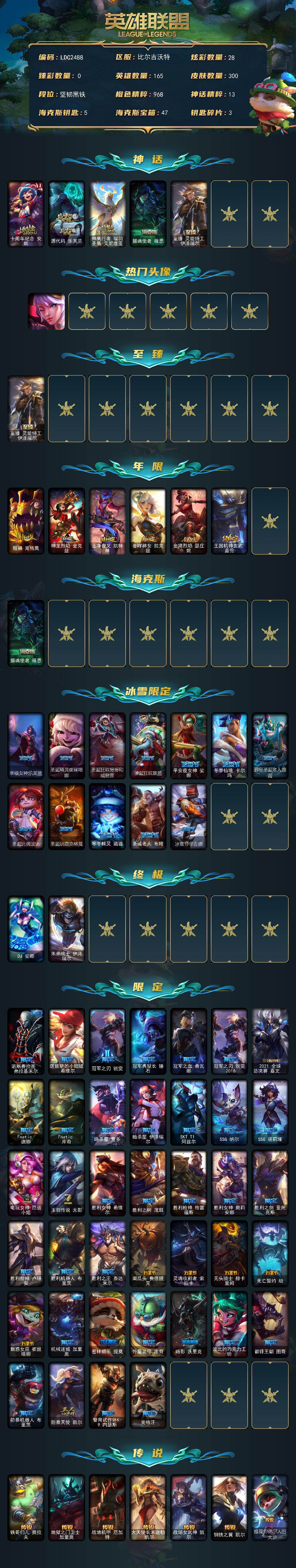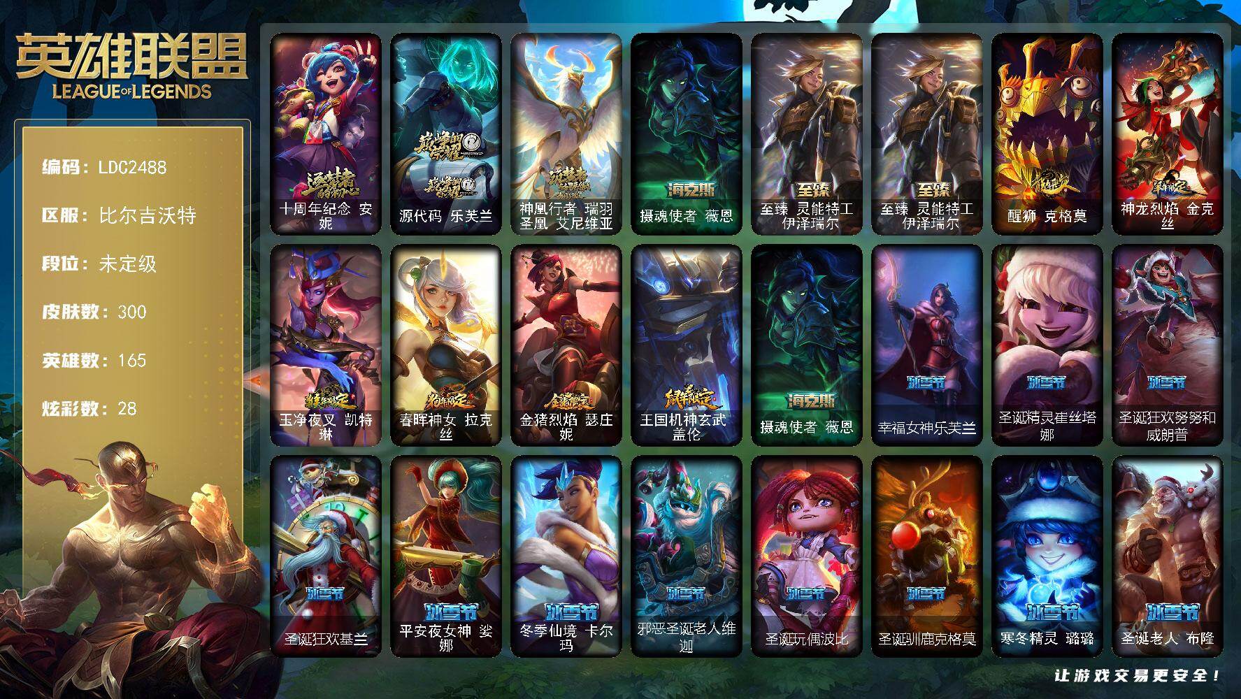 【464377】【LDC2488】165英雄/300皮肤/2终极/5神话/57限定/28炫彩/34传说/62史诗/未定级/十周年纪念安妮/源代码乐芙兰/神凰行者瑞羽凤凰艾尼维亚/摄魂使者薇恩/至臻灵能特工伊泽瑞尔/觅心之翼奎因/醒狮克格莫/神龙烈焰金克丝/玉净夜叉凯特琳/春晖神女拉克丝/金猪烈焰瑟庄妮/王国机神玄武盖伦/幸福女神乐芙兰/圣诞精灵崔丝塔娜/圣诞狂欢努努和威朗普/圣诞狂欢基兰/平安夜