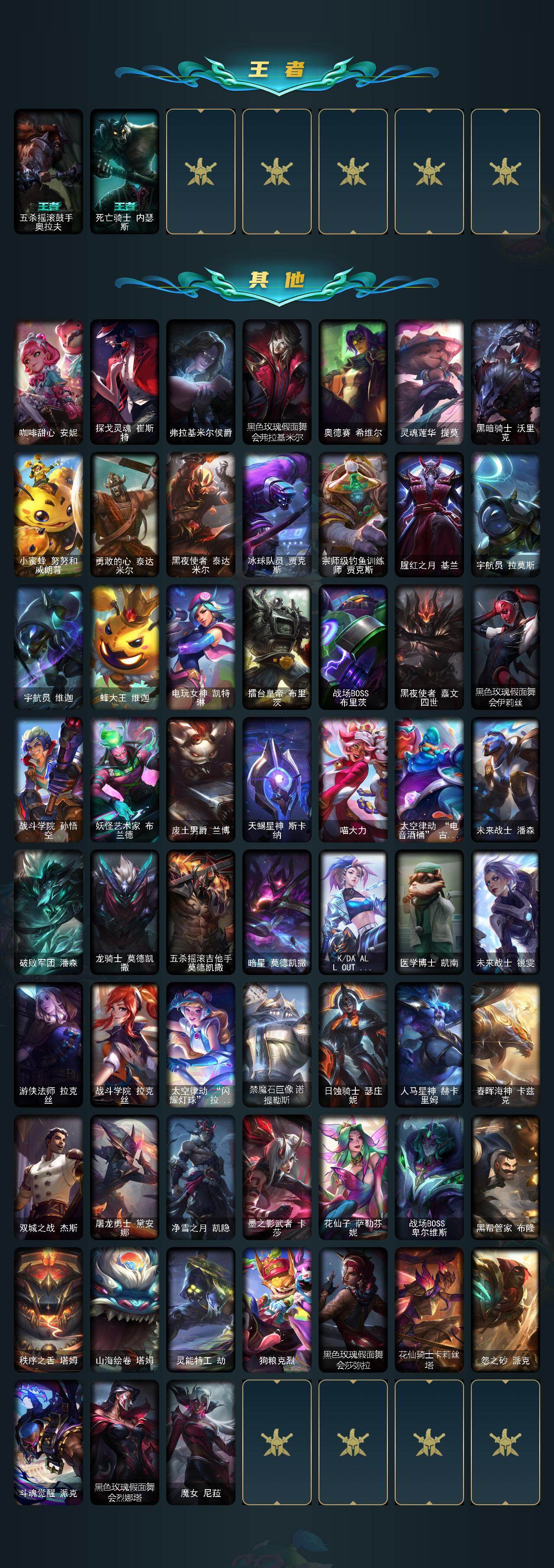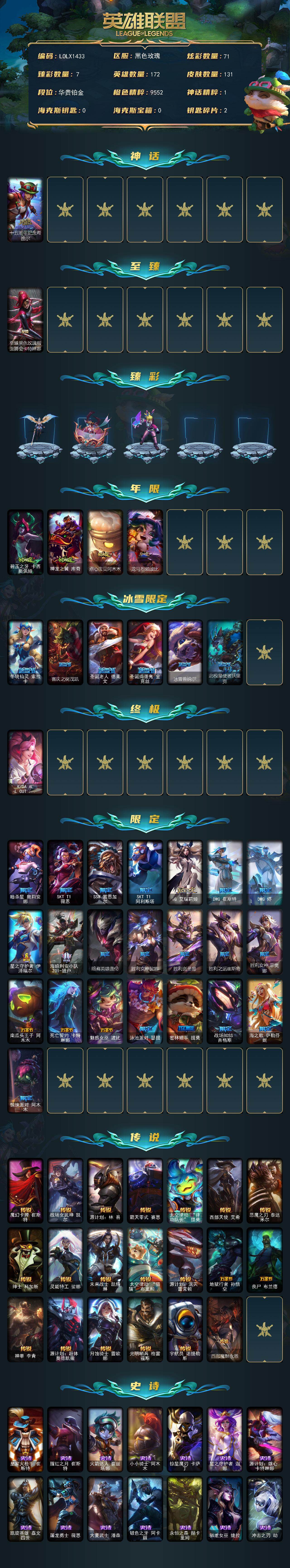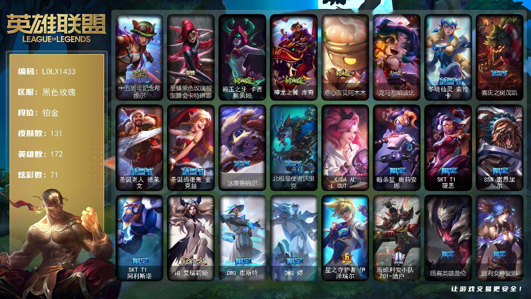 【466162】【LOLX1433】172英雄/131皮肤/3终极/2神话/33限定/7臻彩/71炫彩/20传说/14史诗/铂金/十五周年纪念希维尔/至臻黑色玫瑰假面舞会卡特琳娜/西部魔影永恩忠诚/幻灵白鸽萨勒芬妮梦幻强袭/玉剑传说翼剑仙珠光/玉剑传说琴仙子丁香/幻灵战斗兔锐雯梦幻强袭/星之守护者阿卡丽热情之光/魔女阿卡丽虚荣/碧玉之牙卡西奥佩娅/神龙之翼库奇/点心宝贝阿木木/龙马烈焰波比/冬境