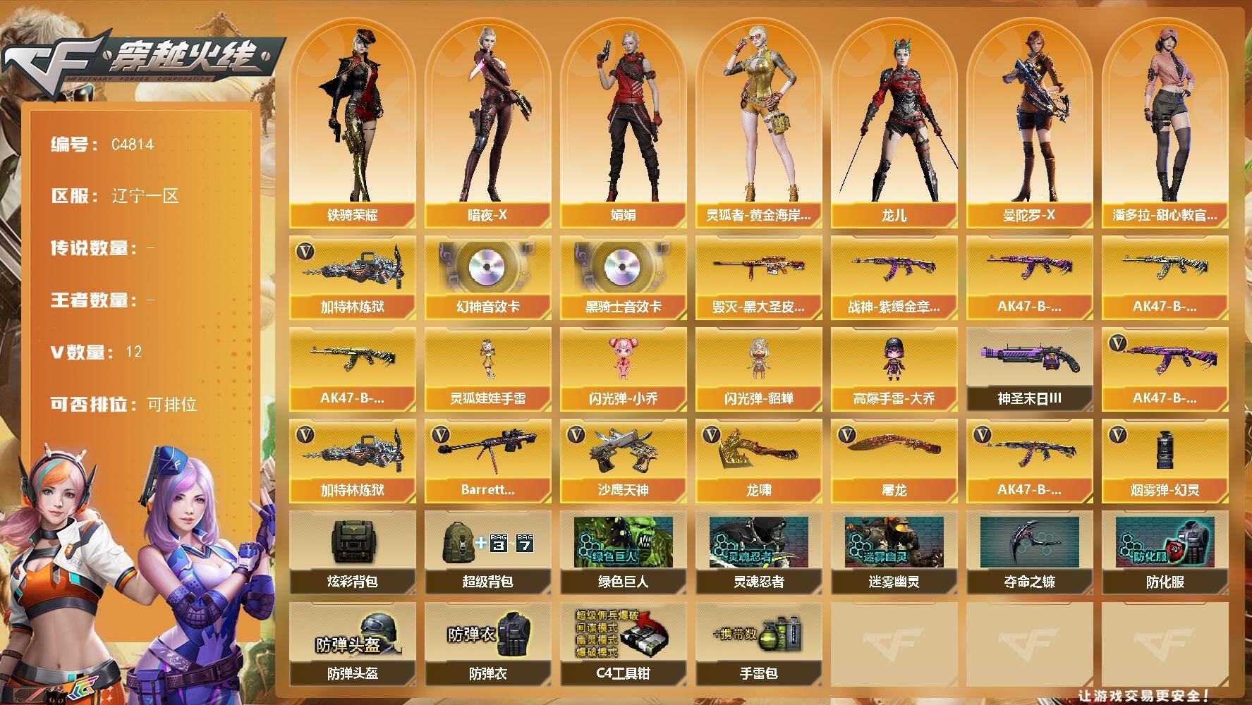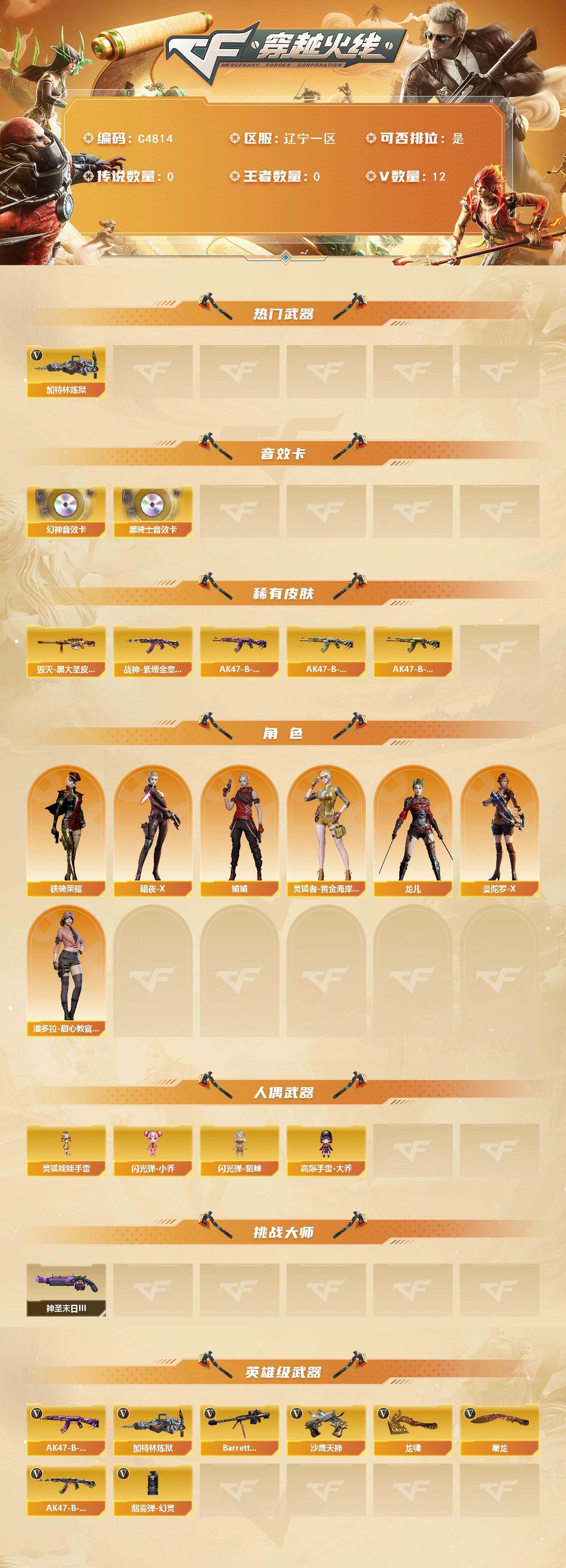 【466216】【466216】[16739494]辽宁一区-12V-0王者武器数-0炫金武器数【热门武器】:加特林-炼狱【音效卡】:M200-幻神音效卡,M