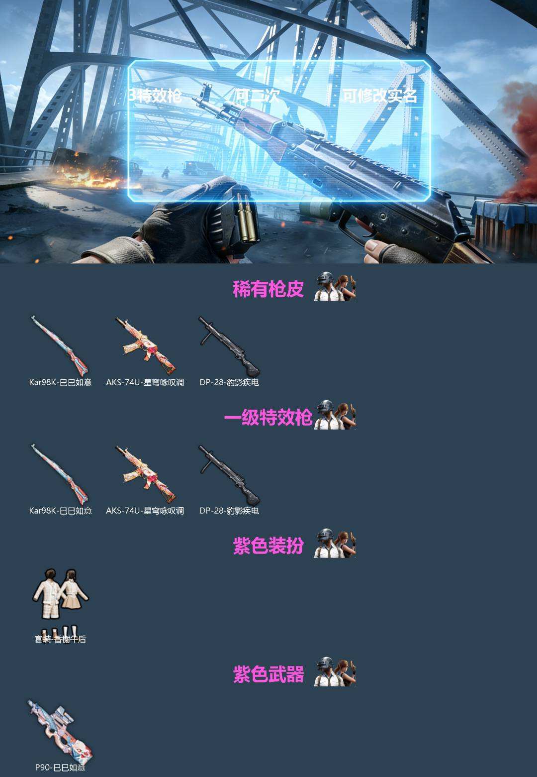 【466297】[16740371]3特效枪 可二次 可修改实名 【稀有枪皮】AKS-74U-星穹咏叹调,Kar98K-巳巳如意,DP-28-豹影疾电【一级特效枪】一级Kar98K-巳巳如意,一级DP-28-豹影疾电,一级AKS-74U-星穹咏叹调【紫色装扮】香榭午后