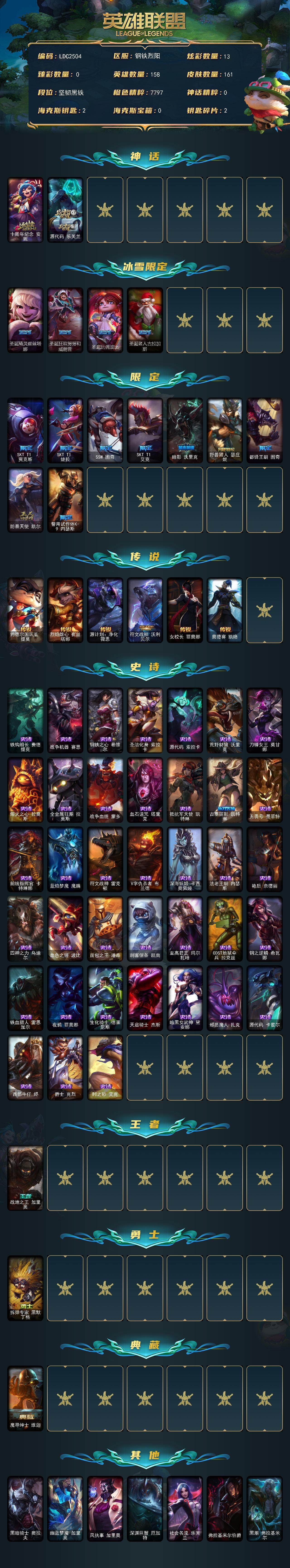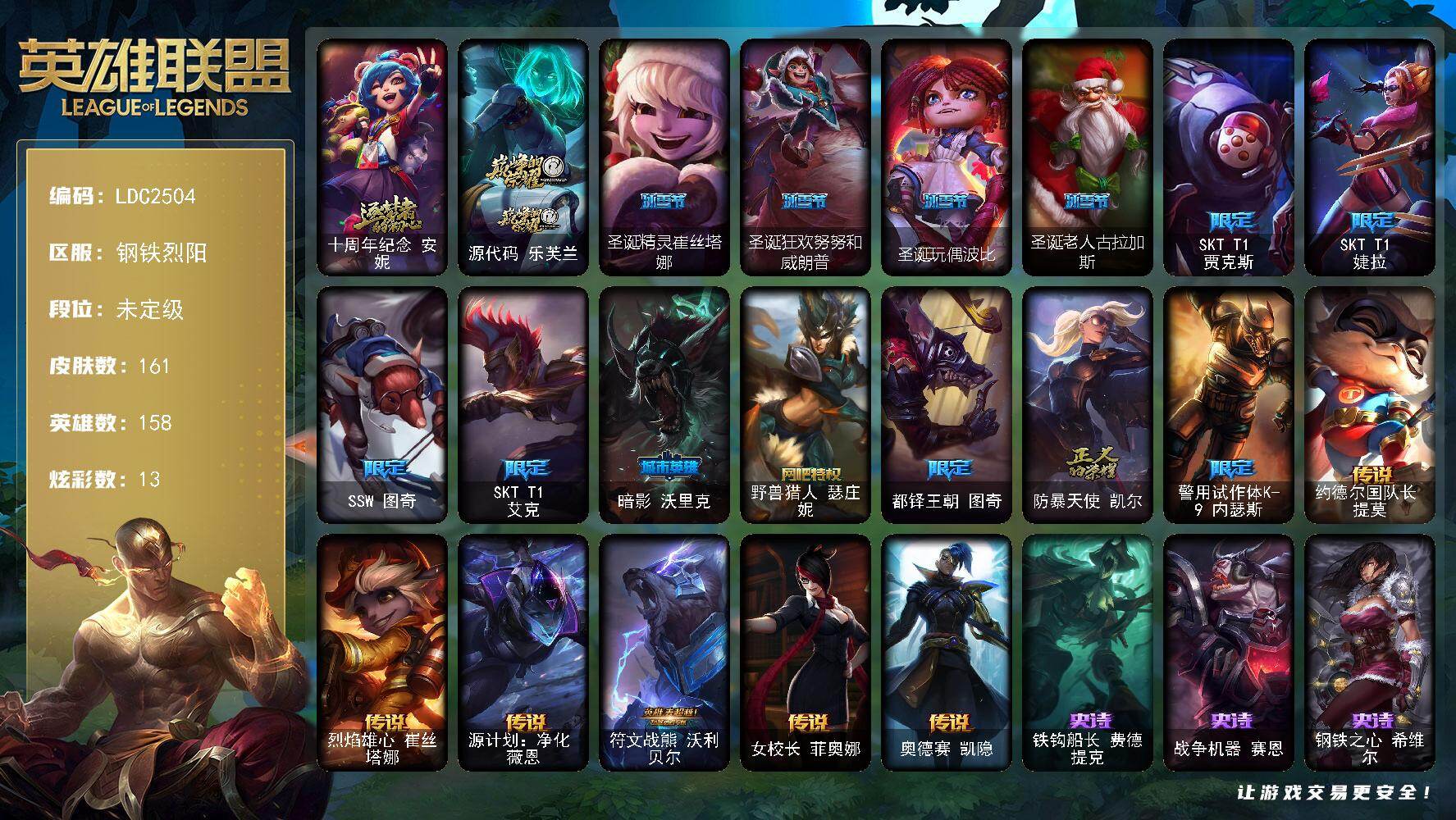 【466578】【LDC2504】158英雄/161皮肤/2神话/13限定/13炫彩/6传说/38史诗/未定级账号等级:318/十周年纪念安妮/源代码乐芙兰/圣诞精灵崔丝塔娜/圣诞狂欢努努和威朗普/圣诞玩偶波比/圣诞老人古拉加斯/SKTT1贾克斯/SKTT1婕拉/SSW图奇/SKTT1艾克/暗影妖狐阿狸/野兽猎人瑟庄妮/都铎王朝图奇/防暴天使凯尔/警用试作体K-9内瑟斯/约德尔国队长提莫/烈焰雄
