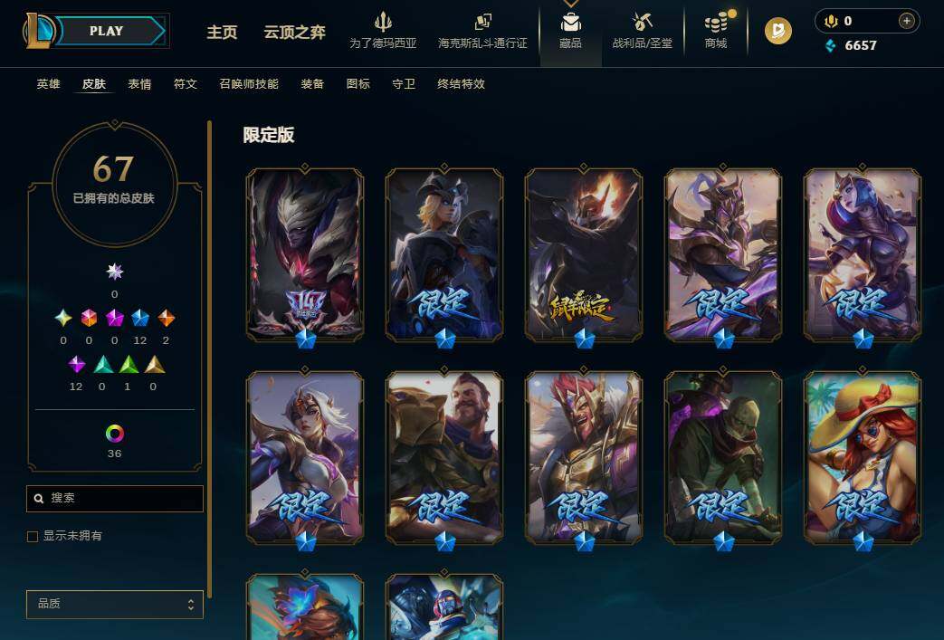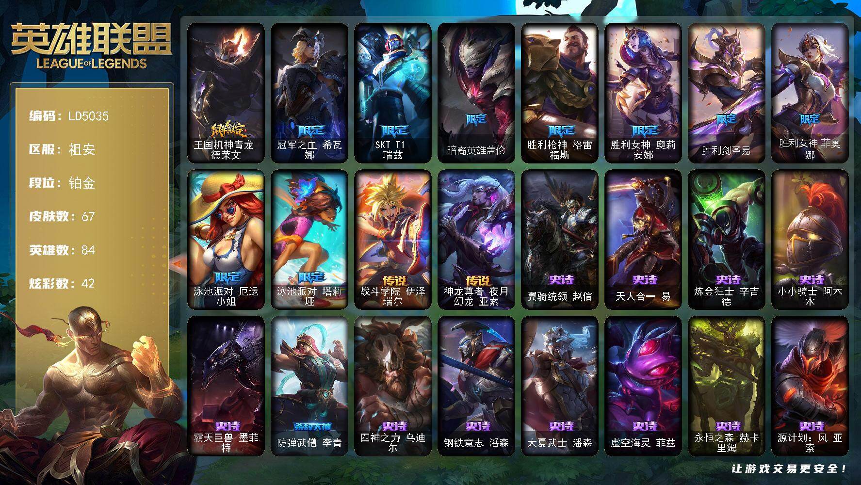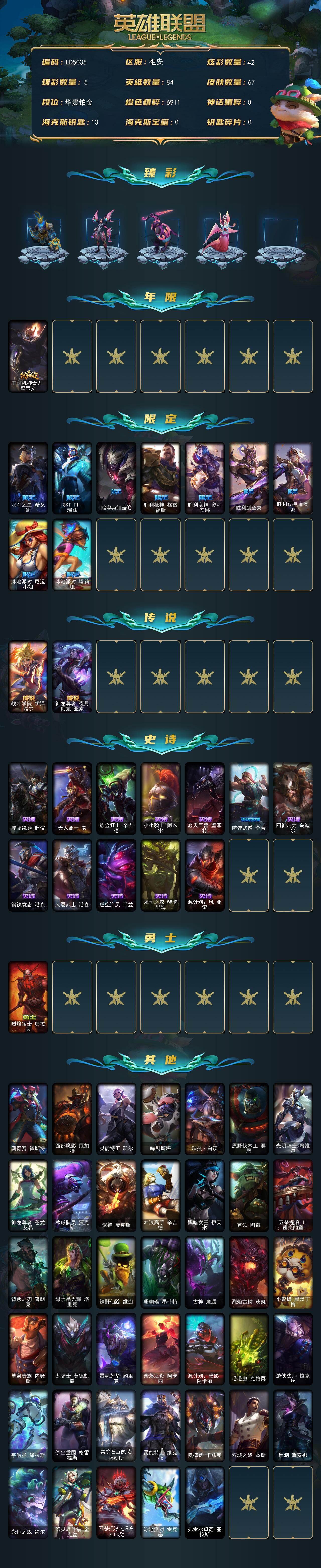 【469212】【LD5035】84英雄/67皮肤/12限定/5臻彩/42炫彩/2传说/12史诗/铂金/冠军典狱长锤石凯旋圣装/弹幕天使卡莎炽天使勇敢/源计划毁灭派克幻灭/玉剑传说苍鸾丁香/霸天异形卡兹克丛林灾厄/王国机神青龙德莱文/冠军之血希瓦娜/SKTT1瑞兹/暗裔英雄盖伦/胜利枪神格雷福斯/胜利女神奥莉安娜/胜利剑圣易/胜利女神菲奥娜/泳池派对厄运小姐/泳池派对塔莉垭/双城之战2微光实验室