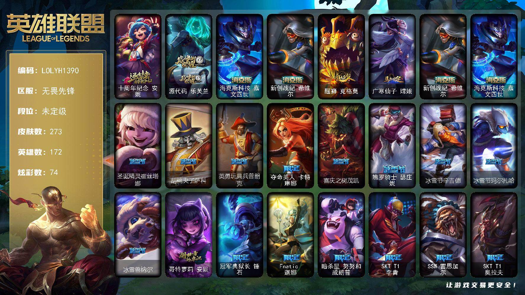 【469934】【LOLYH1390】172英雄/273皮肤/4神话/39限定/6臻彩/74炫彩/22传说/69史诗/未定级/十周年纪念安妮/源代码乐芙兰/海克斯科技嘉文四世/新创战纪希维尔/觅心游侠卢锡安/无畏骑士瑟庄妮赤子初心/吕布奉先炫金战神/冠军典狱长锤石凯旋圣装/魔女阿卡丽虚荣/净雪之月莫甘娜冬虹/醒狮克格莫/广寒仙子嫦娥/圣诞精灵崔丝塔娜/胡桃夹子萨科/英勇玩具兵普朗克/夺命美人卡特
