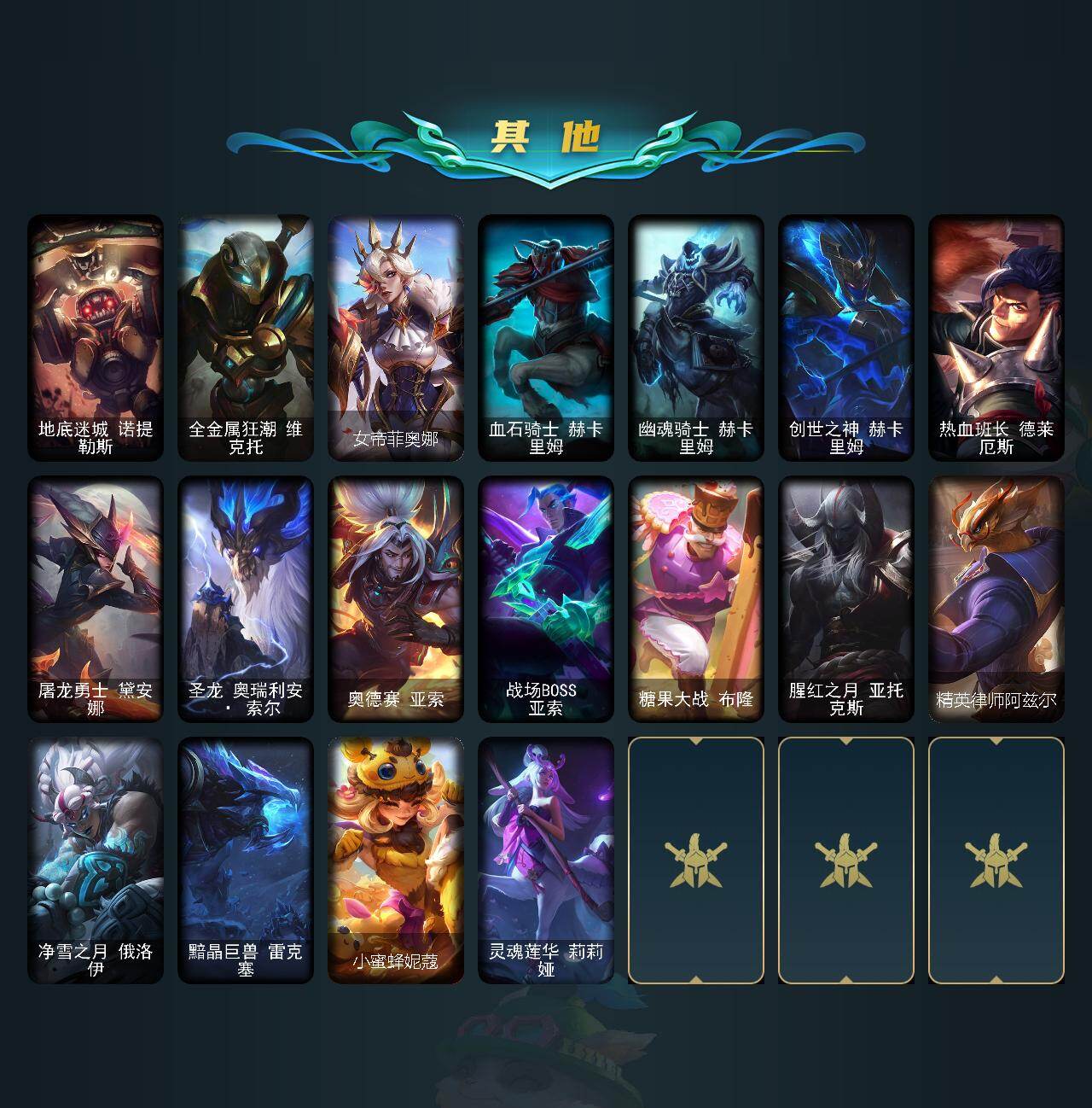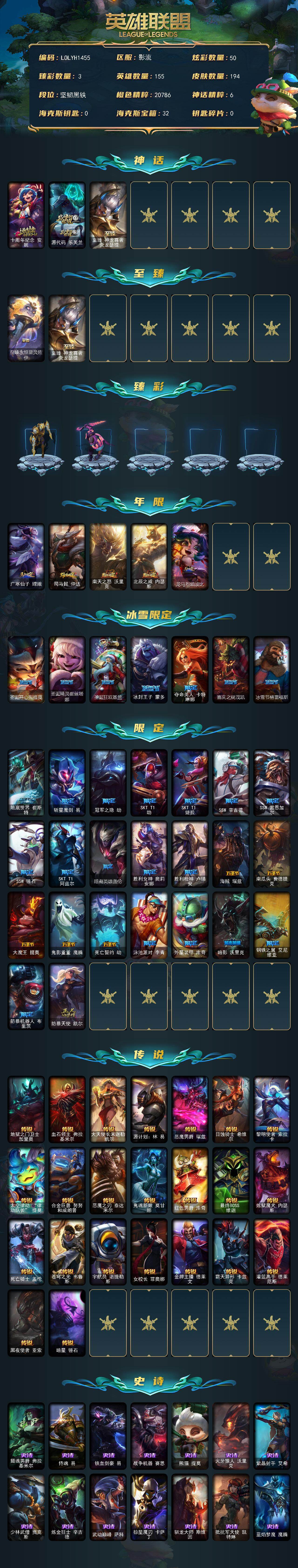 【475948】【LOLYH1455】155英雄/194皮肤/4神话/35限定/3臻彩/50炫彩/23传说/48史诗/未定级/十周年纪念安妮/源代码乐芙兰/至臻神龙尊者炎龙瑟提/至臻永恒星灵佐伊/冠军之隐劫凯旋圣装/源计划毁灭派克幻灭/墨之影武者永恩灵墨刻影/广寒仙子嫦娥/司马懿仲达/南天之怒沃里克/北辰之威内瑟斯/龙马烈焰波比/圣诞开心鬼提莫/圣诞精灵崔丝塔娜/圣诞狂欢基兰/冰封王子蒙多/夺命