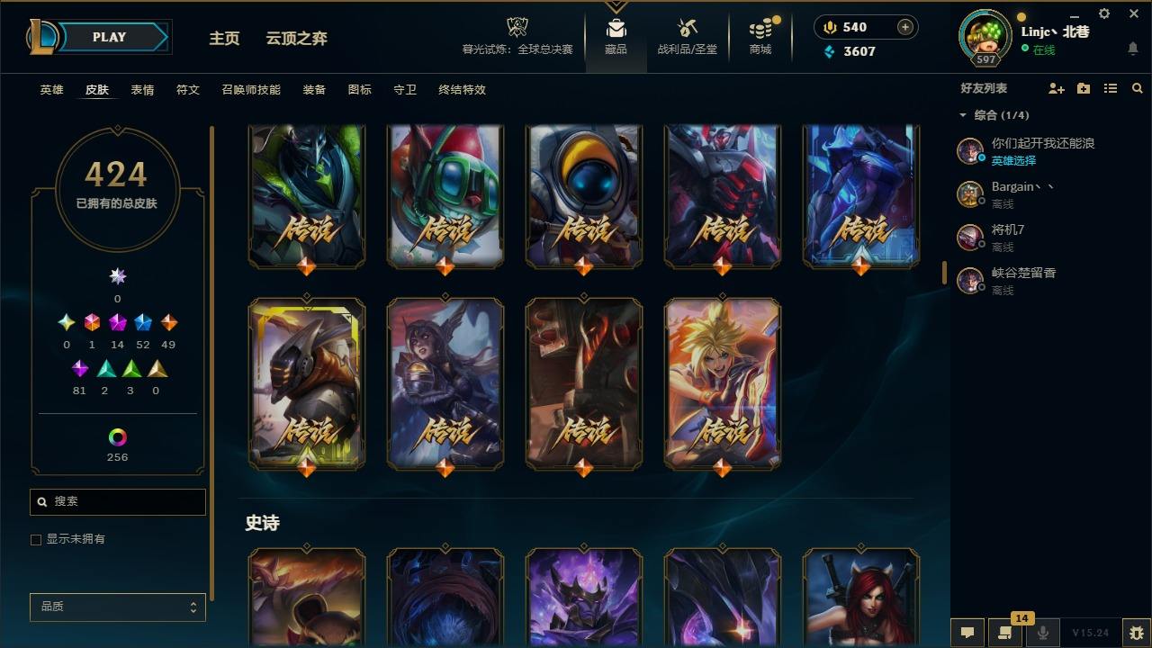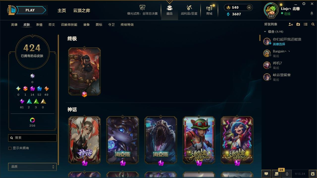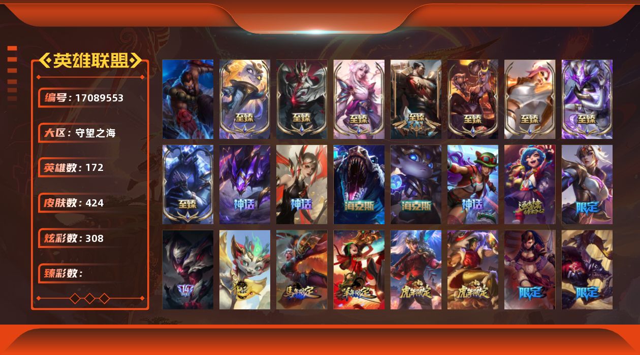 【478849】[17089553]1终极 14神话 52限定 49传说 81史诗 424皮肤 308炫彩 172英雄 可二次 可修改实名 【至臻】水晶掠夺者 卡兹克,至臻 福牛守护者 菲奥娜,至臻 DRX 亚托克斯,殿堂传奇 乐芙兰,至臻 斗魂觉醒 萨科,至臻 灵魂莲华 拉克丝,至臻 烈焰美人 薇恩,至臻 凯旋将军 德莱厄斯,至臻 永恒星灵 佐伊 【海克斯】海克斯 波比,海克斯 雷克顿 【限定
