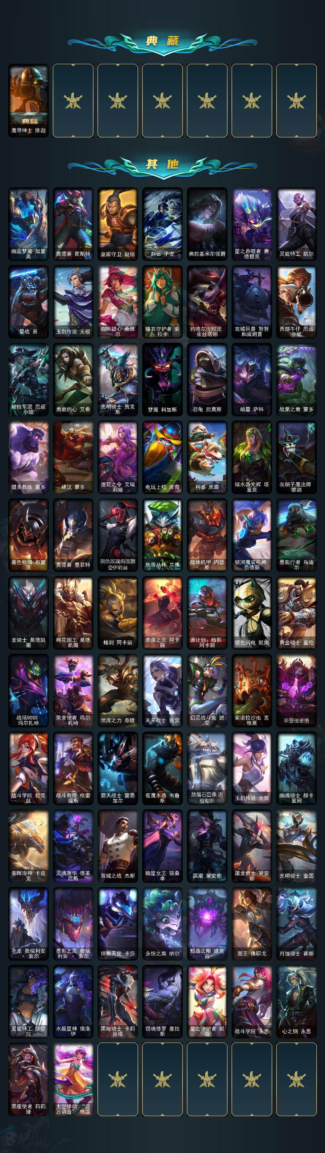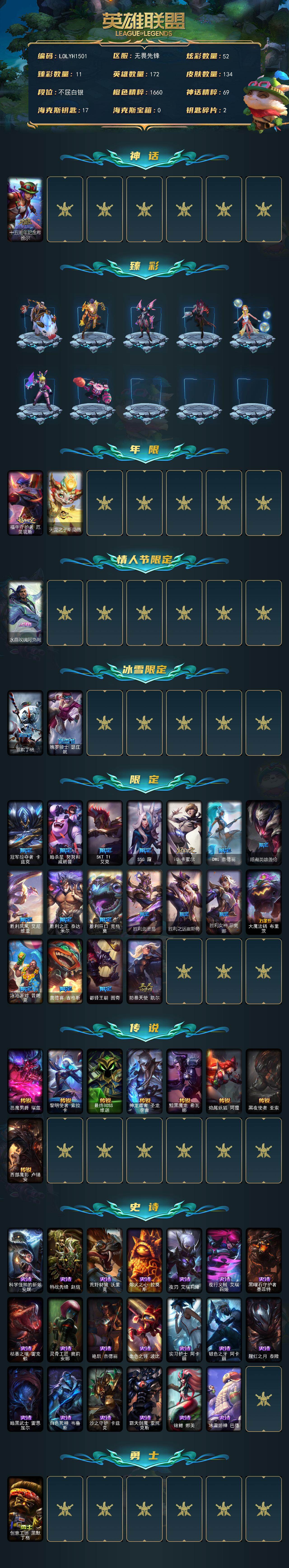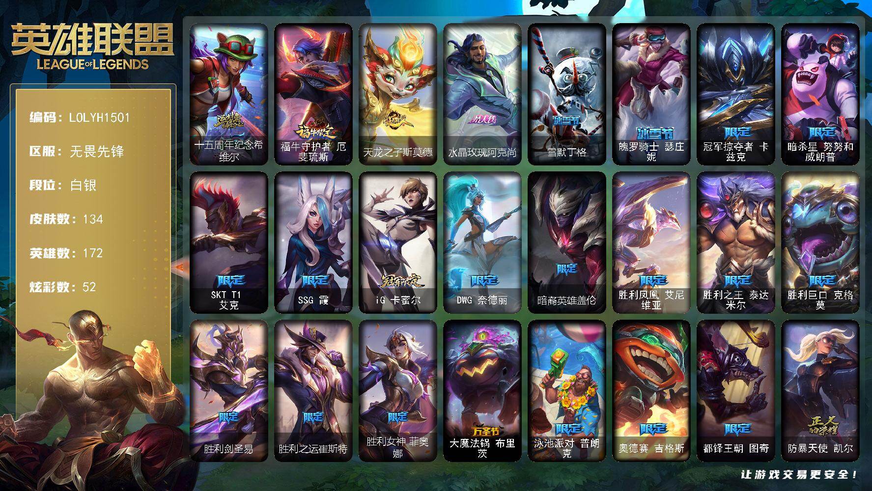 【483806】【LOLYH1501】172英雄/134皮肤/1神话/24限定/11臻彩/52炫彩/8传说/20史诗/白银/十五周年纪念希维尔/无畏骑士瑟庄妮赤子初心/神龙尊者圣龙李青龙腾云起/弹幕天使卡莎炽天使勇敢/西部魔影卢锡安贝利尔之怠/泳池派对辛德拉荔枝枝连击/幻灵战斗兔锐雯梦幻强袭/可爱可爱粉红红布里茨/魔女阿卡丽虚荣/心之钢伊泽瑞尔锐意曲风/霸天异形卡兹克丛林灾厄/福牛守护者厄斐琉斯