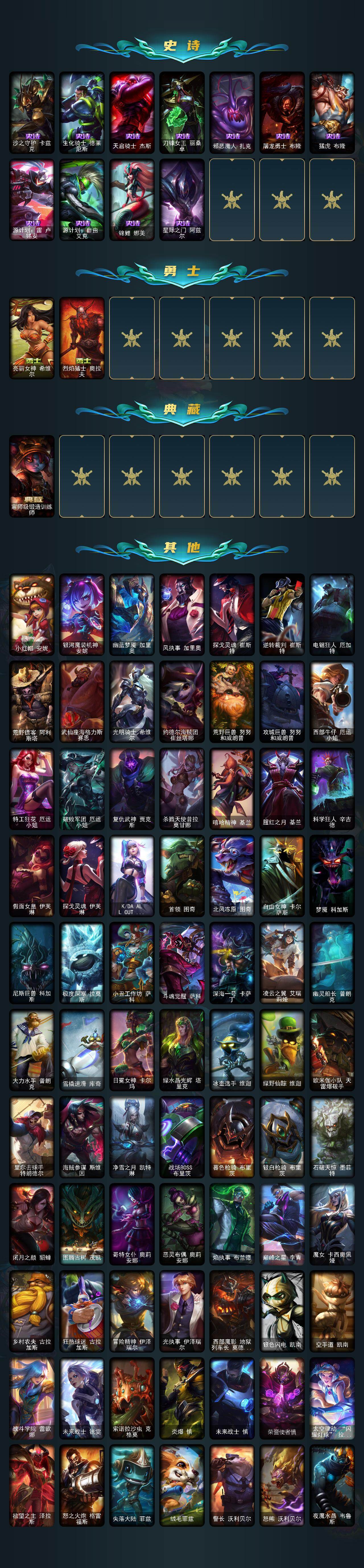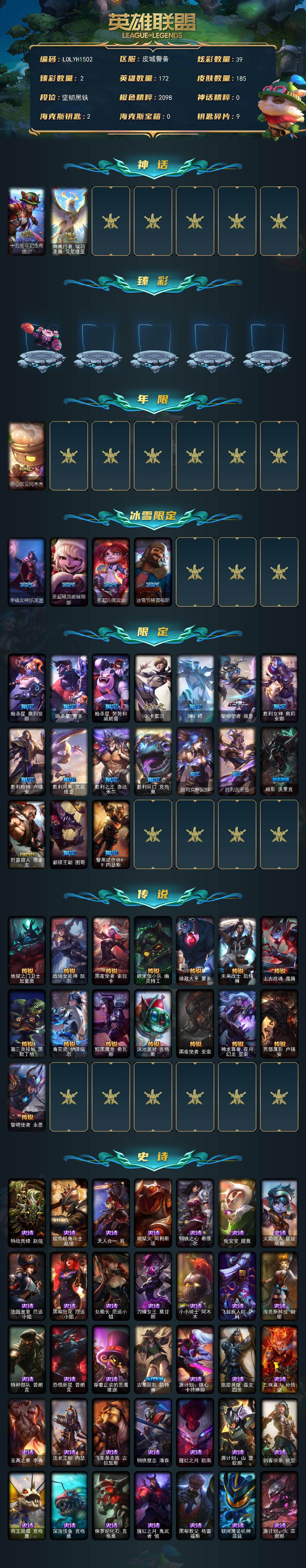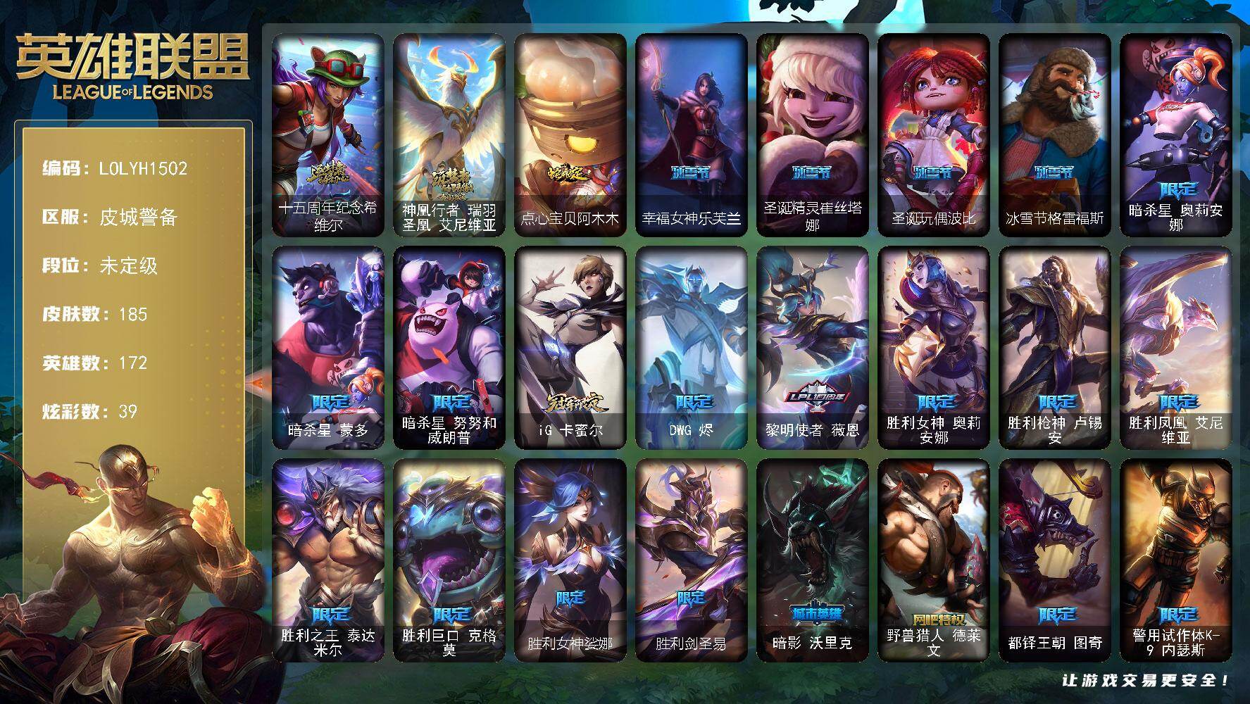 【483816】【LOLYH1502】172英雄/185皮肤/2神话/22限定/2臻彩/39炫彩/15传说/46史诗/未定级/十五周年纪念希维尔/神凰行者瑞羽凤凰艾尼维亚/可爱可爱粉红红布里茨/星之守护者阿卡丽未来之光/点心宝贝阿木木/幸福女神乐芙兰/圣诞精灵崔丝塔娜/圣诞玩偶波比/冰雪节格雷福斯/暗杀星奥莉安娜/暗杀星蒙多/暗杀星努努和威朗普/IG卡密尔/DWG烬/黎明使者薇恩/胜利女神奥莉安