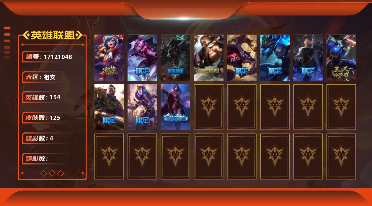 【483943】[17121048]未定级段位-154英雄-125皮肤-4炫彩-0终极-1神话-12限定-8传说-31史诗【神话皮肤】:十周年纪念安妮【冰雪限定】:幸福女神乐芙兰,夺命美人卡特琳娜,喜庆之树茂凯【限定皮肤】:冠军之血希瓦娜,冠军之矛卡莉丝塔,胜利枪神格雷福斯,胜利女神奥莉安娜,暗影沃里克,野兽猎人德莱文,勇者奈德丽,都铎王朝图奇,防暴天使凯尔【传说皮肤】:恶魔之刃泰达米尔,最终B