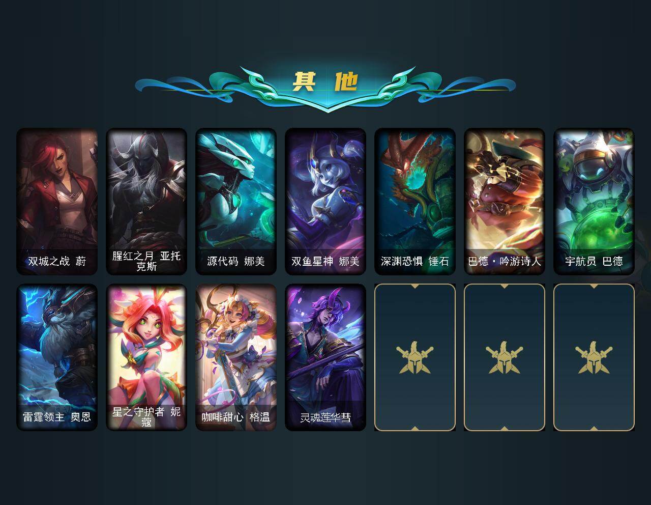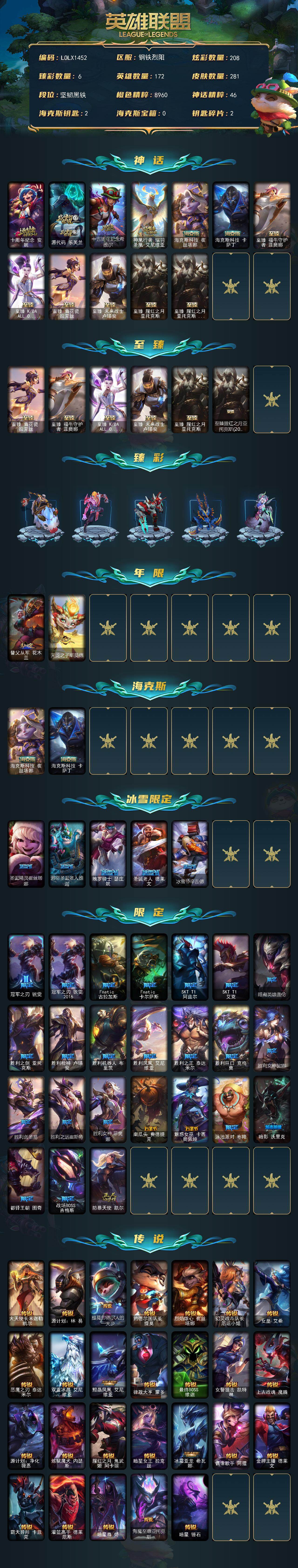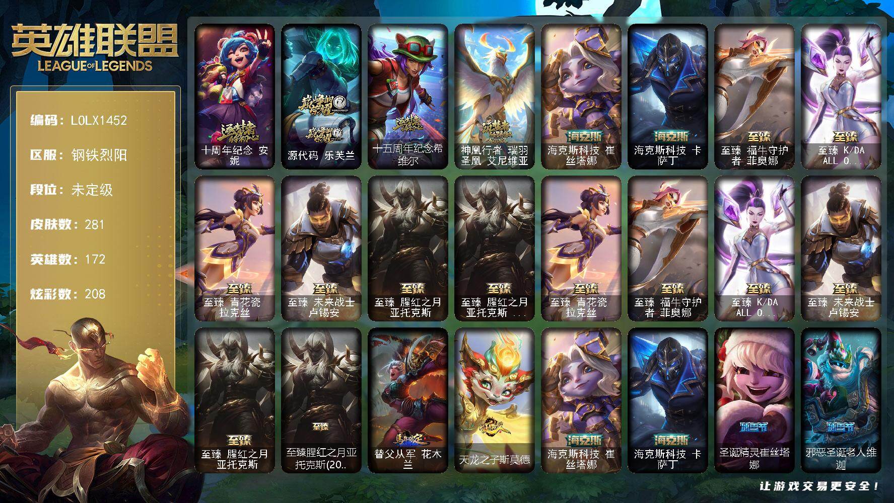 【486045】【LOLX1452】172英雄/281皮肤/12神话/33限定/6臻彩/208炫彩/26传说/59史诗/未定级/十周年纪念安妮/源代码乐芙兰/十五周年纪念希维尔/神凰行者瑞羽凤凰艾尼维亚/海克斯科技崔丝塔娜/海克斯科技卡萨丁/至臻福牛守护者菲奥娜/至臻K/DAALLOUT卡莎/至臻青花瓷拉克丝/至臻未来战士卢锡安/至臻腥红之月亚托克斯/至臻腥红之月亚托克斯(2022)/至臻腥红之