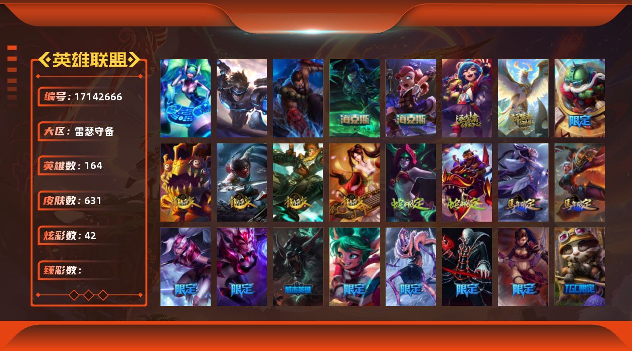 【487738】[17142666]3终极 6神话 107限定 59传说 173史诗 631皮肤 42炫彩 164英雄 可二次 可修改实名 【海克斯】摄魂 薇恩,海克斯 安妮【限定】钢铁军团 拉克丝,奥斯曼大帝 泰达米尔,舞会公主 安妮,巨角幻兽 阿利斯塔,暗黑灵魂 阿利斯塔,哥特萝莉 安妮【情人节限定】觅心猎手 薇恩,觅心女王 艾希,觅心游侠 卢锡安【赛季限定皮】胜利女神 奥莉安娜,胜利之剑