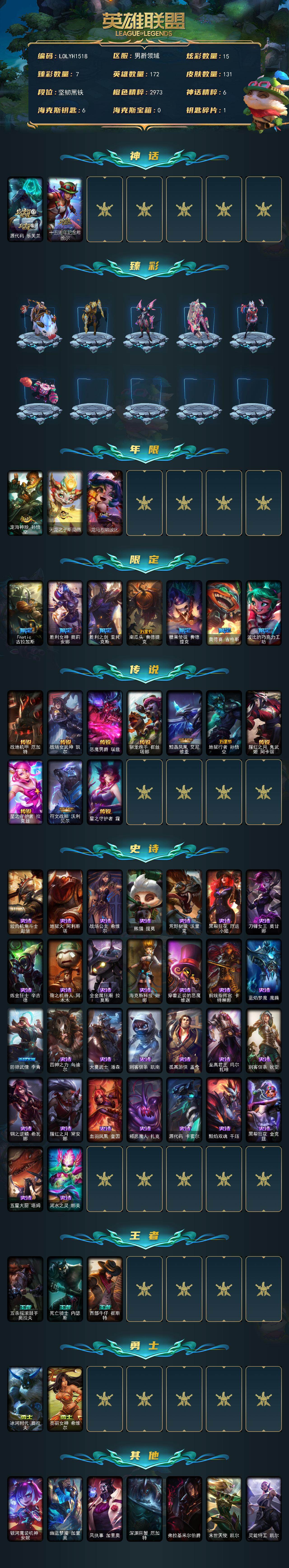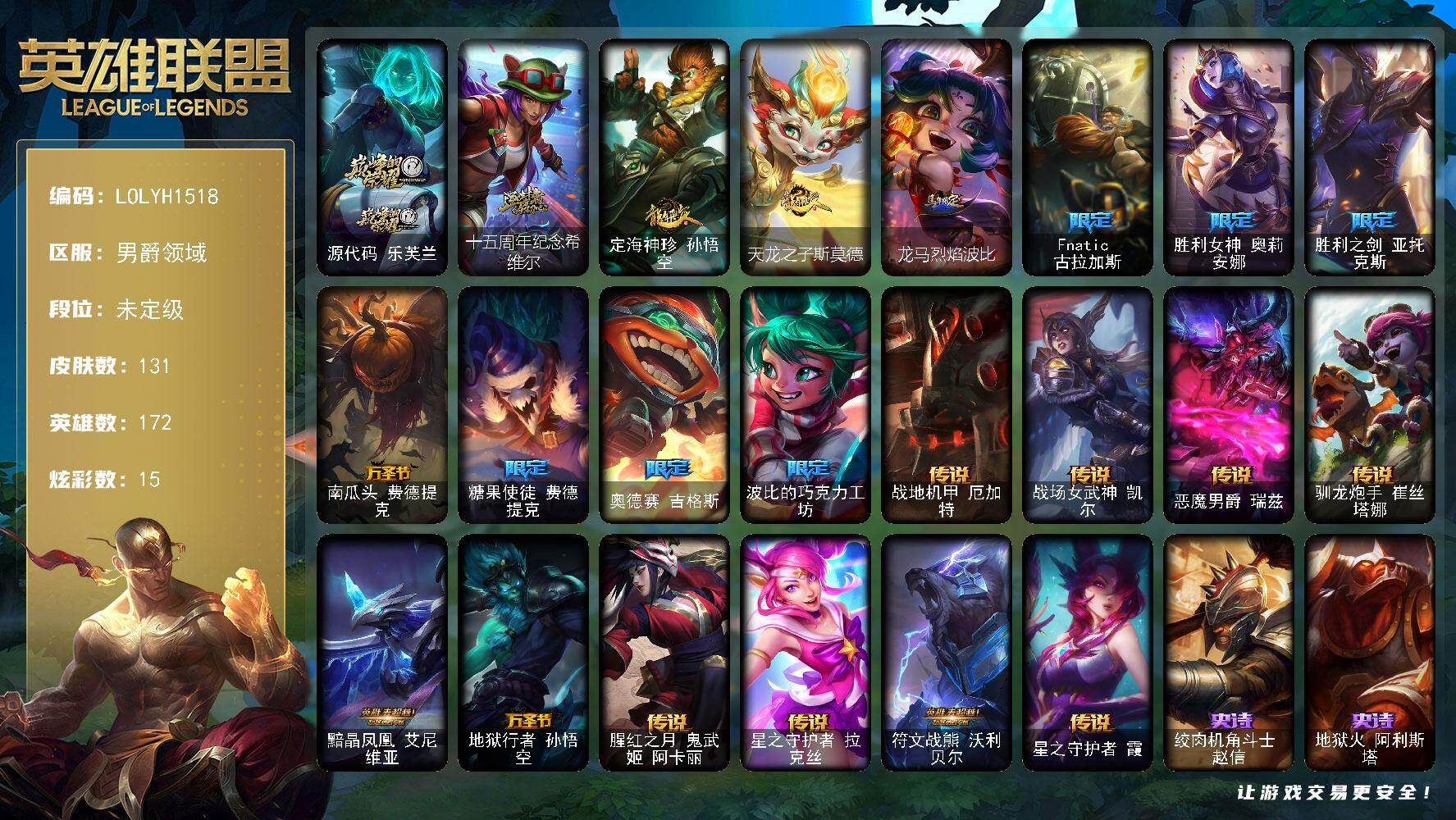 【489894】【LOLYH1518】172英雄/131皮肤/2神话/10限定/7臻彩/15炫彩/10传说/30史诗/未定级/源代码乐芙兰/十五周年纪念希维尔/无畏骑士瑟庄妮赤子初心/冠军之隐劫凯旋圣装/弹幕天使卡莎炽天使勇敢/幻灵战斗猫金克丝梦幻强袭/星之守护者卡莎热情之光/可爱可爱粉红红布里茨/魔女阿卡丽虚荣/定海神针孙悟空/天龙之子斯莫德/龙马烈焰波比/Fnatic古拉加斯/胜利女神奥莉安
