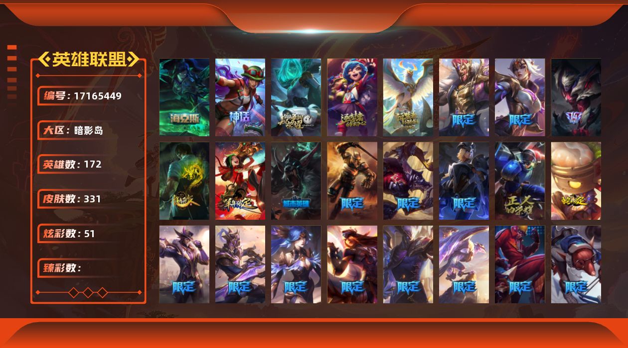 【491080】[17165449]5神话 25限定 28传说 84史诗 331皮肤 51炫彩 172英雄 可二次 可修改实名 【海克斯】摄魂 薇恩【赛季限定皮】胜利行刑官 德莱文,胜利凤凰 艾尼维亚,胜利女神-菲奥娜,胜利之运 崔斯特,胜利剑圣 易,胜利女神 娑娜,胜利女神 希维尔,胜利之剑 亚托克斯【冠军限定系列】S13 T1 李青,S3 SKT T1 李青,S4 SSW 图奇【冰雪节限定】