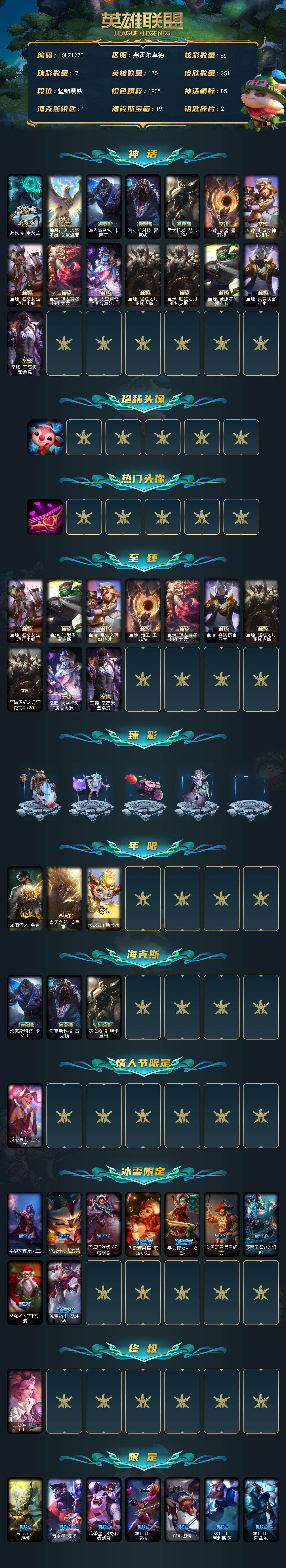 【491407】【LOLZ1270】170英雄/351皮肤/3终极/15神话/48限定/7臻彩/85炫彩/34传说/79史诗/未定级/源代码乐芙兰/神凰行者瑞羽凤凰艾尼维亚/海克斯科技卡萨丁/海克斯科技雷克顿/零之枪骑赫卡里姆/至臻征服者贾克斯/至臻真实伤害亚索/至臻至高天奎桑提/至臻暗星墨菲特/至臻电玩女神凯特琳/至臻魅惑女巫厄运小姐/至臻神龙尊者均衡之龙沃利贝尔/至臻太空律动魔音海妖娜美/至
