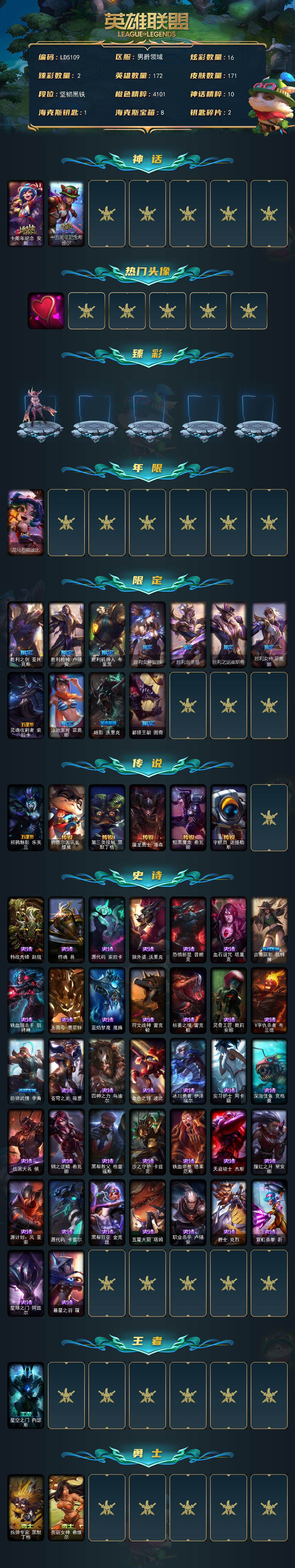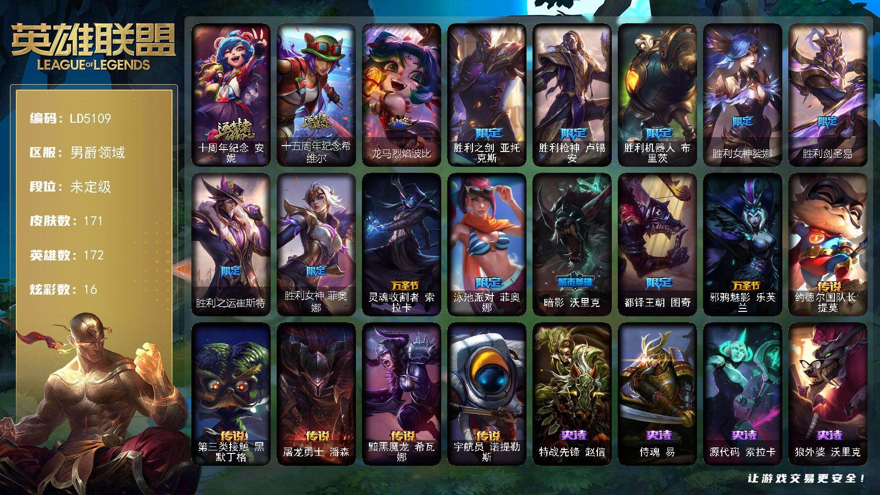 【493711】【LD5109】172英雄/171皮肤/2神话/13限定/2臻彩/16炫彩/6传说/37史诗/未定级/十周年纪念安妮/十五周年纪念希维尔/爱意绵绵/破败军团厄运小姐灵岛征伐使/魔女阿卡丽虚荣/龙马烈焰波比/胜利之剑亚托克斯/胜利枪神卢锡安/胜利机器人布里茨/胜利女神娑娜/胜利剑圣易/胜利之运崔斯特/胜利女神菲奥娜/灵魂收割者索拉卡/泳池派对菲奥娜/暗影妖狐阿狸/都铎王朝图奇/邪鸦