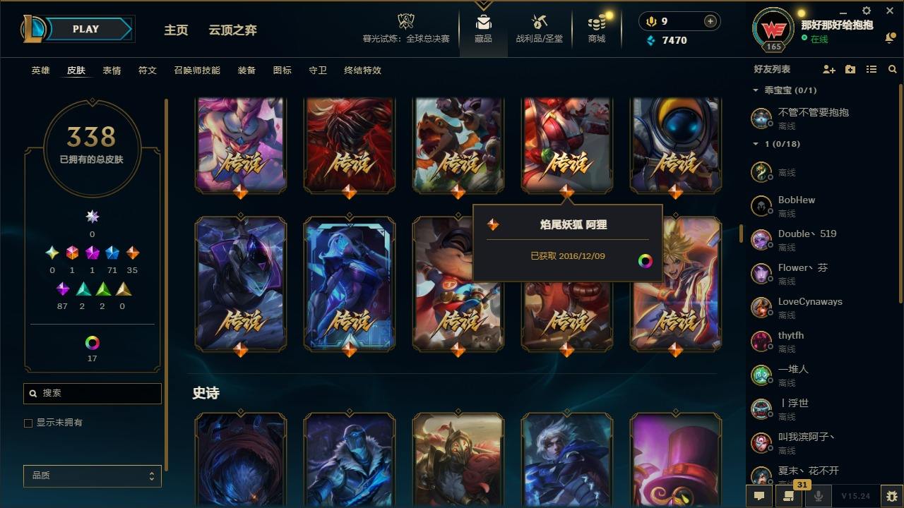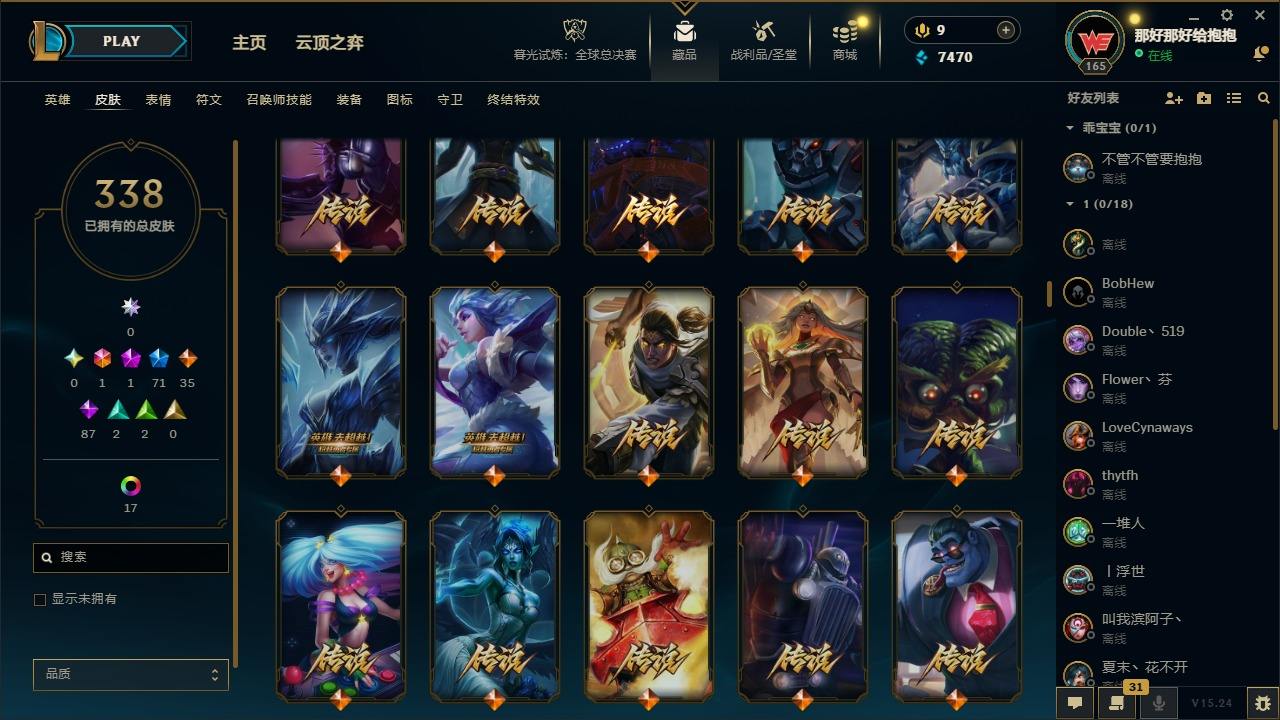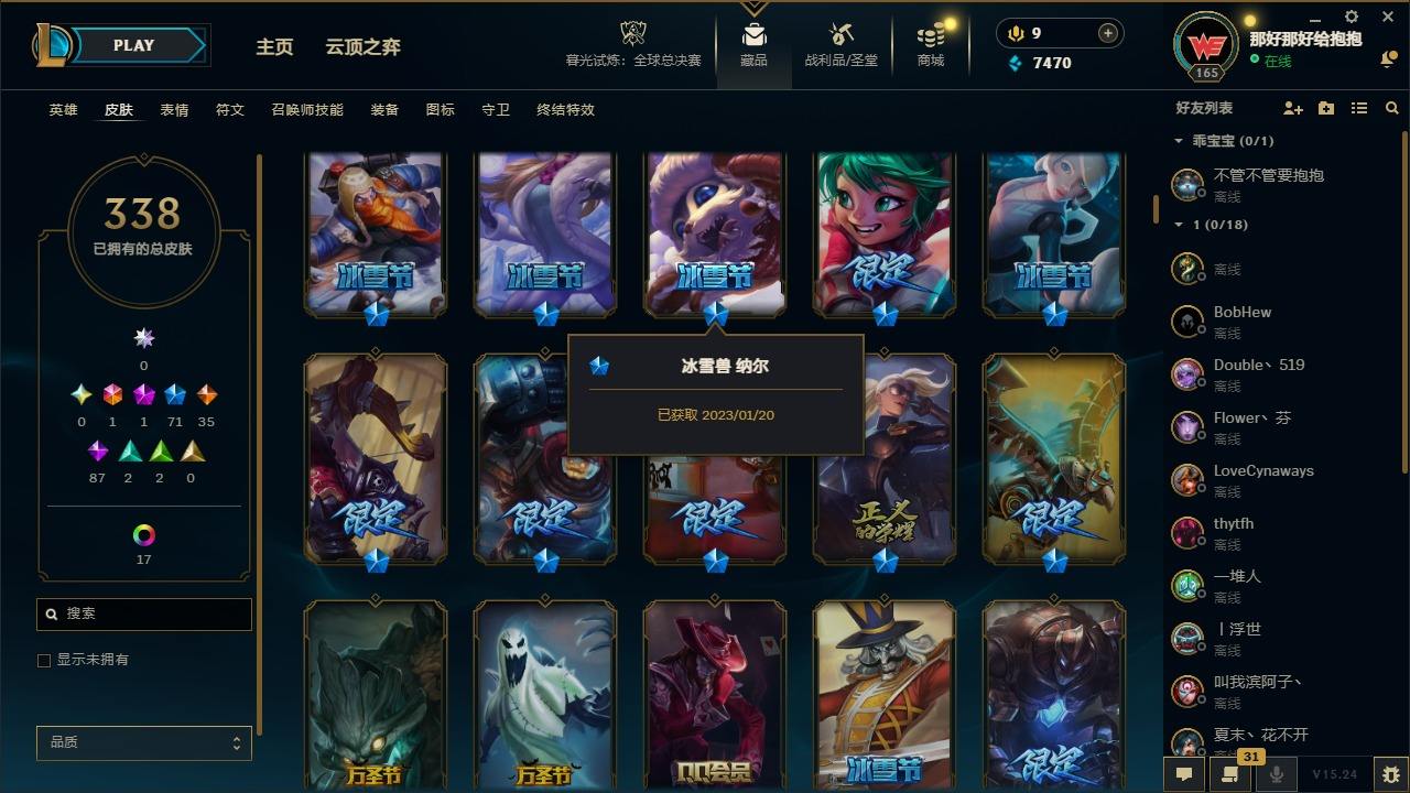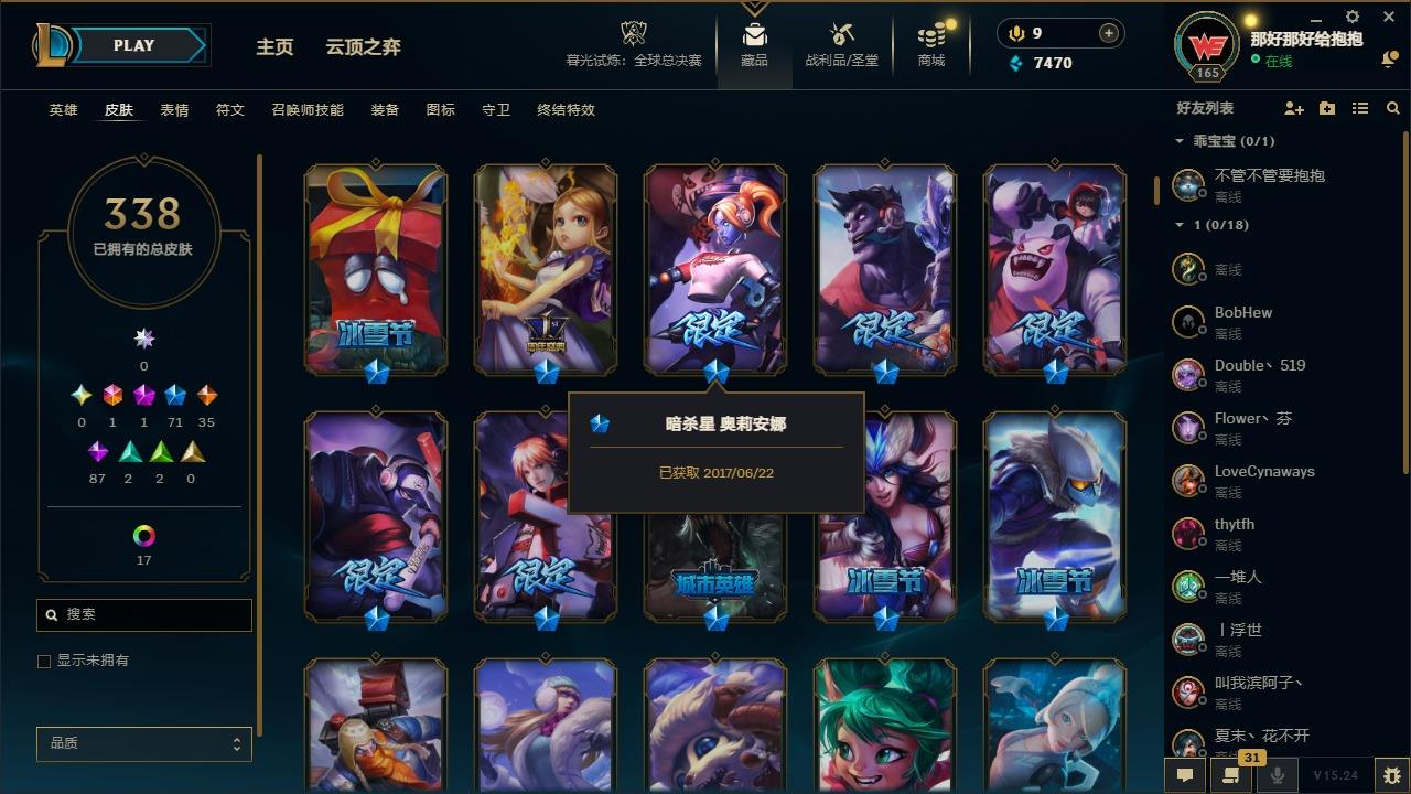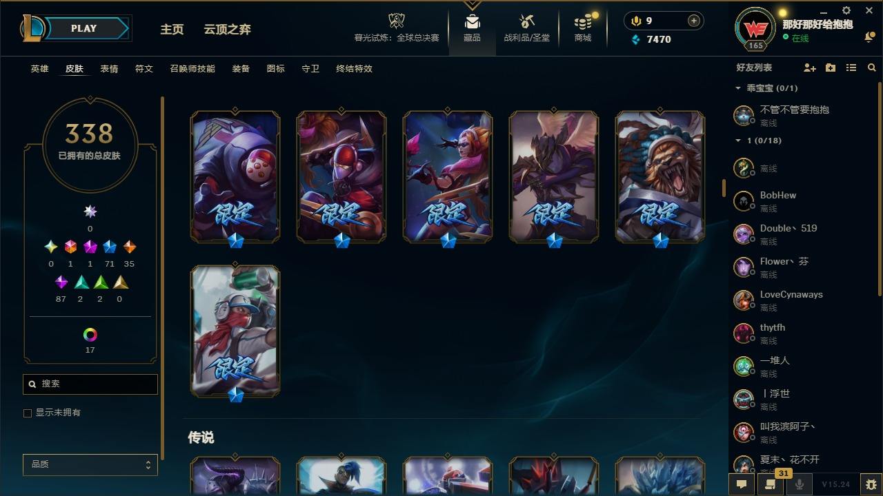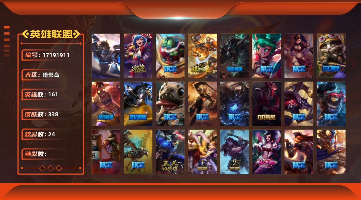 【495062】[17191911]1终极 1神话 71限定 35传说 87史诗 338皮肤 24炫彩 161英雄 可二次 可修改实名 【情人节限定】觅心猎手 薇恩【赛季限定皮】胜利凤凰 艾尼维亚,胜利之王 泰达米尔,胜利女神 希维尔,胜利之树 茂凯,胜利枪神 格雷福斯,胜利女神 奥莉安娜,胜利之剑 亚托克斯【冠军限定系列】S1FNC 嘉文四世,S1FNC 卡尔萨斯,S2 暗杀星 发条,S2 暗
