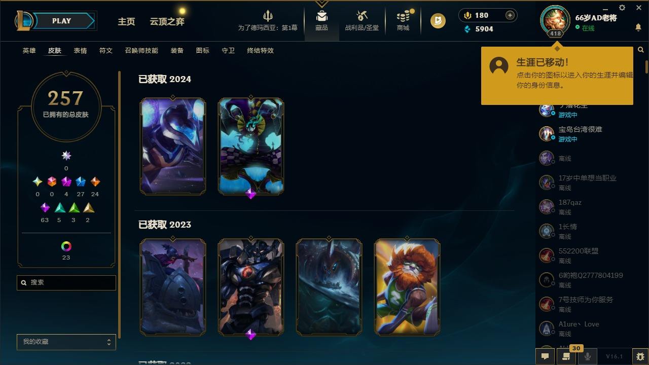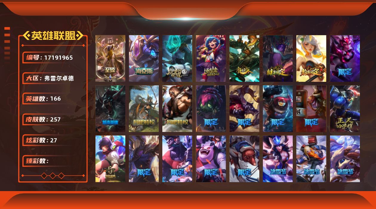 【495073】[17191965]4神话 27限定 24传说 63史诗 257皮肤 27炫彩 166英雄 可二次 可修改实名 【至臻】至臻 K/DA 阿狸【海克斯】海克斯 克格莫【赛季限定皮】胜利之剑 亚托克斯【冠军限定系列】S2 暗杀星 蒙多,S2 暗杀星 努努,S4 SSW 图奇【冰雪节限定】冰雪风暴 希维尔,冰雪节 辛吉德,冰雪兽 纳尔,胡桃夹子 萨科,平安夜女神 娑娜【泳池派对】泳池派