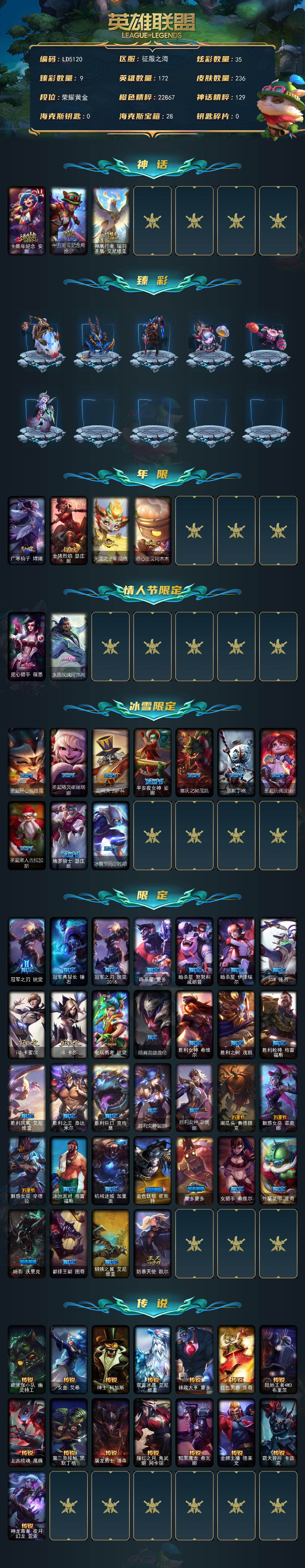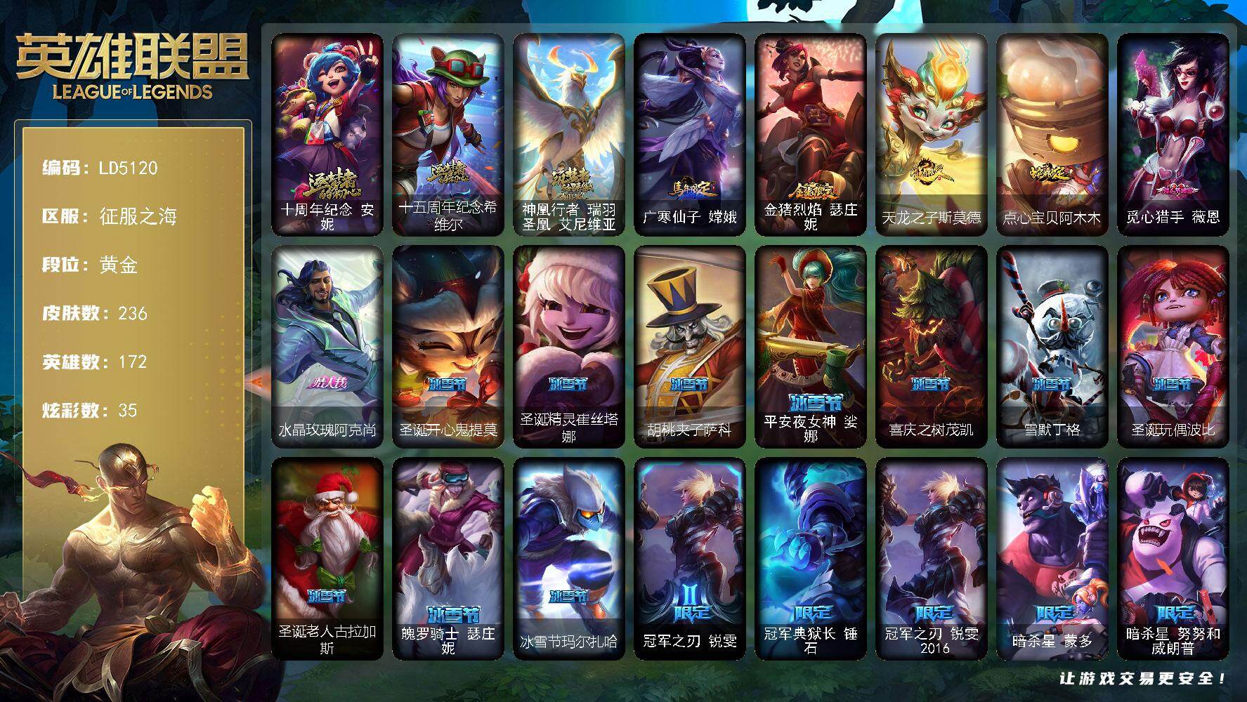 【496552】【LD5120】172英雄/236皮肤/3神话/49限定/9臻彩/35炫彩/15传说/60史诗/黄金/十周年纪念安妮/十五周年纪念希维尔/神凰行者瑞羽凤凰艾尼维亚/无畏骑士瑟庄妮赤子初心/霸天异形卡兹克掠空魅影/玉剑传说无劫胭脂/咖啡甜心璐璐焦糖布丁/可爱可爱粉红红布里茨/海之歌艾希冰爽浪花/咖啡甜心格温酒醉樱桃/魔女阿卡丽虚荣/净雪之月莫甘娜冬虹/广寒仙子嫦娥/金猪烈焰瑟庄妮/