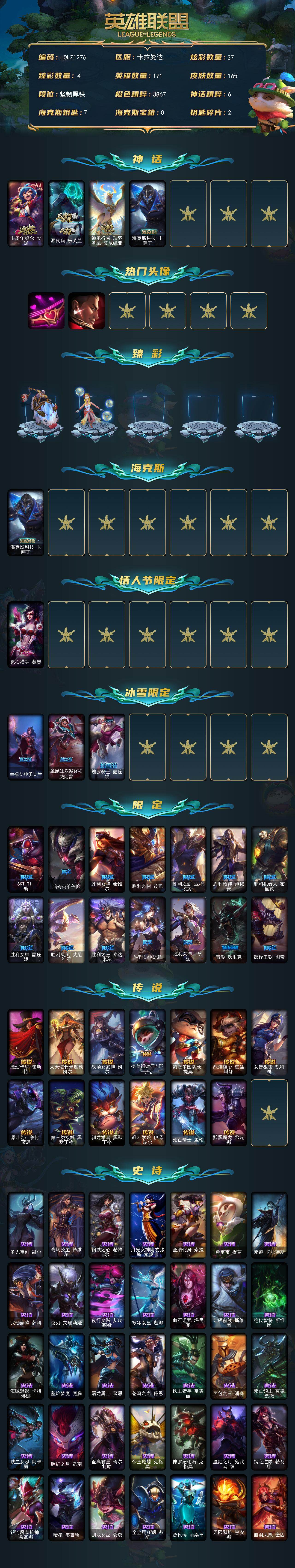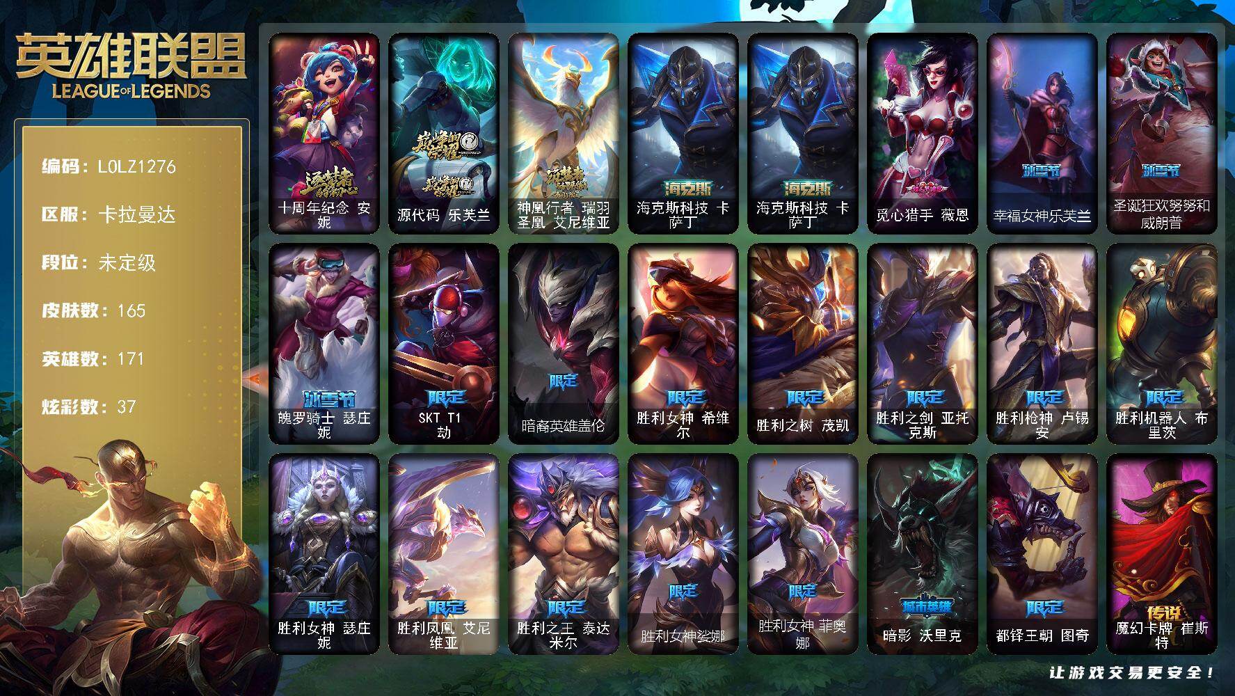 【496974】【LOLZ1276】171英雄/165皮肤/4神话/19限定/4臻彩/37炫彩/13传说/40史诗/未定级账号等级:625/十周年纪念安妮/源代码乐芙兰/神凰行者瑞羽凤凰艾尼维亚/海克斯科技卡萨丁/爱情之歌/觅心游侠卢锡安/无畏骑士瑟庄妮赤子初心/泳池派对辛德拉荔枝枝连击/魔女阿卡丽虚荣/花仙子崔丝塔娜蓝闪/觅心猎手薇恩/幸福女神乐芙兰/圣诞狂欢努努和威朗普/魄罗骑士瑟庄妮/SK
