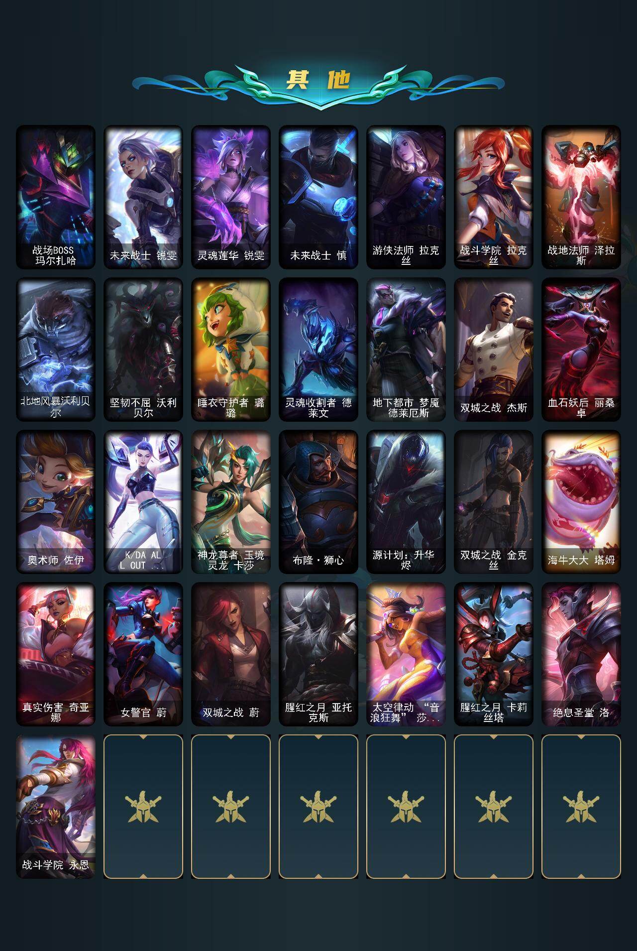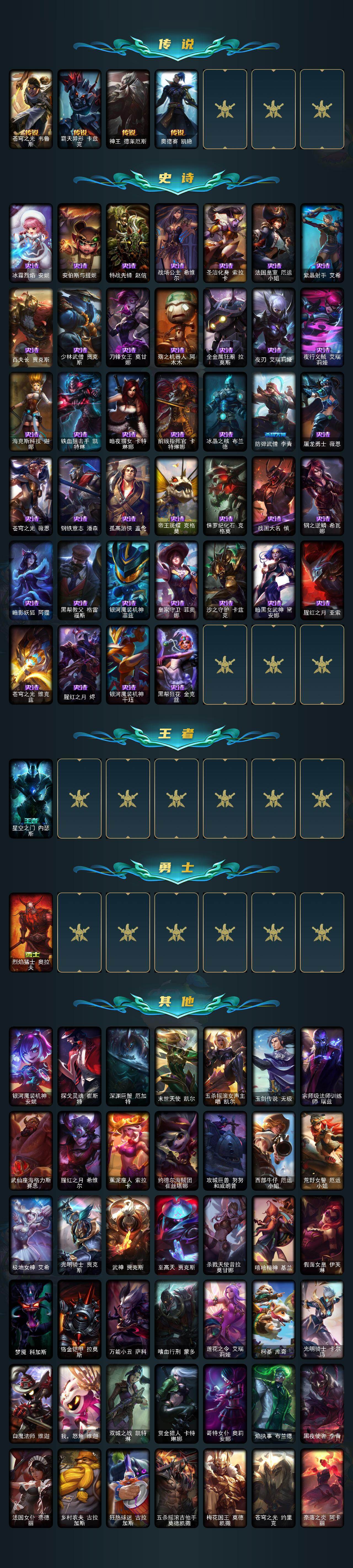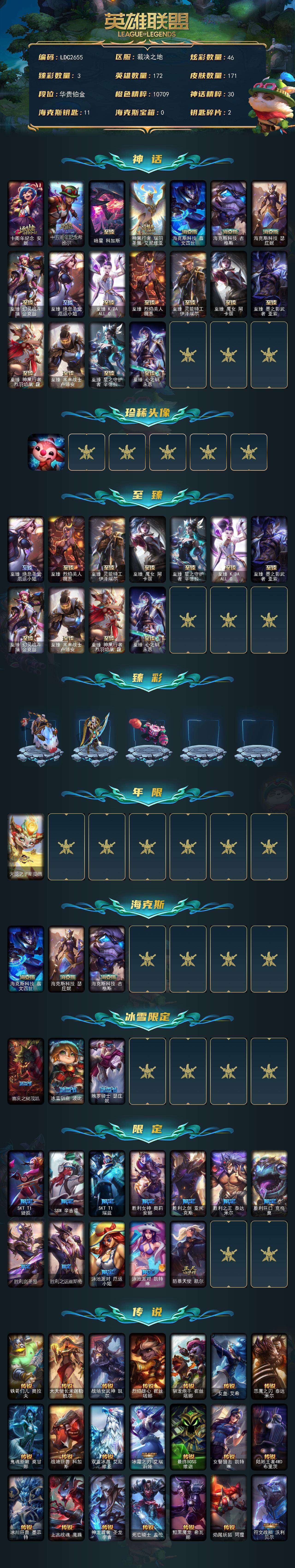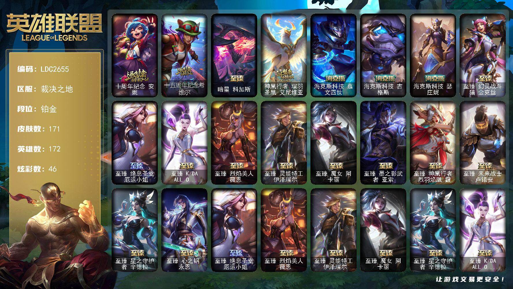 【497320】【LDC2655】172英雄/171皮肤/18神话/16限定/3臻彩/46炫彩/25传说/39史诗/铂金/十周年纪念安妮/十五周年纪念希维尔/暗星科加斯/神凰行者瑞羽凤凰艾尼维亚/海克斯科技嘉文四世/海克斯科技吉格斯/海克斯科技瑟庄妮/至臻幻灵战斗猫金克丝/至臻绝息圣堂厄运小姐/至臻K/DAALLOUT卡莎/至臻烈焰美人薇恩/至臻灵能特工伊泽瑞尔/至臻魔女阿卡丽/至臻墨之影武者亚